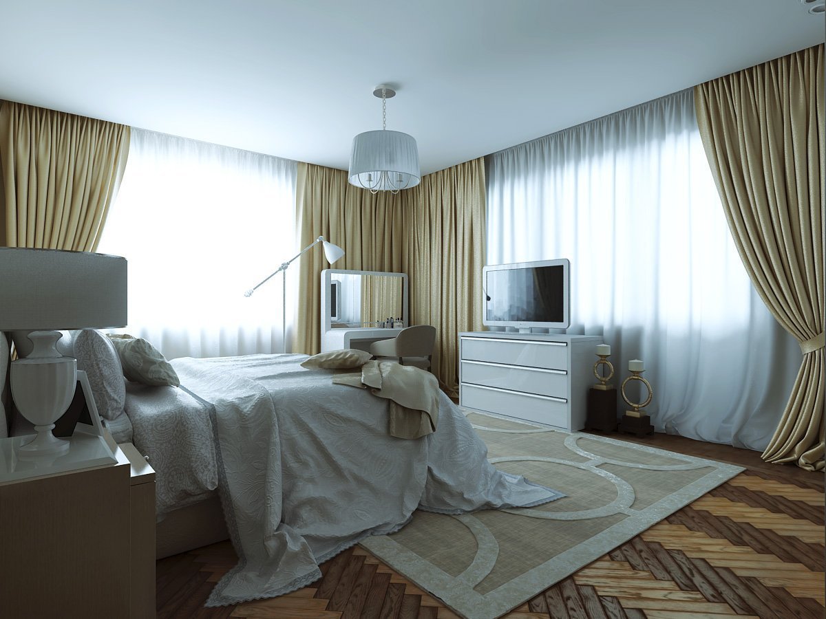 Интерьер спальни с двумя окнами