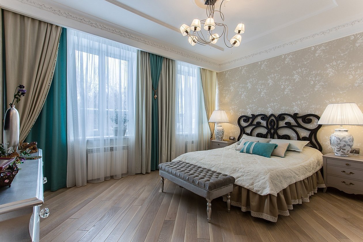 Синие шторы в интерьере спальни