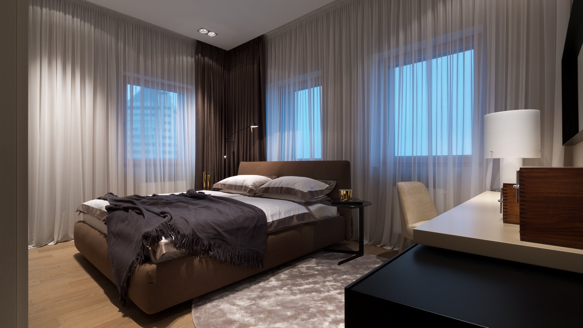 Современная спальня с двумя окнами