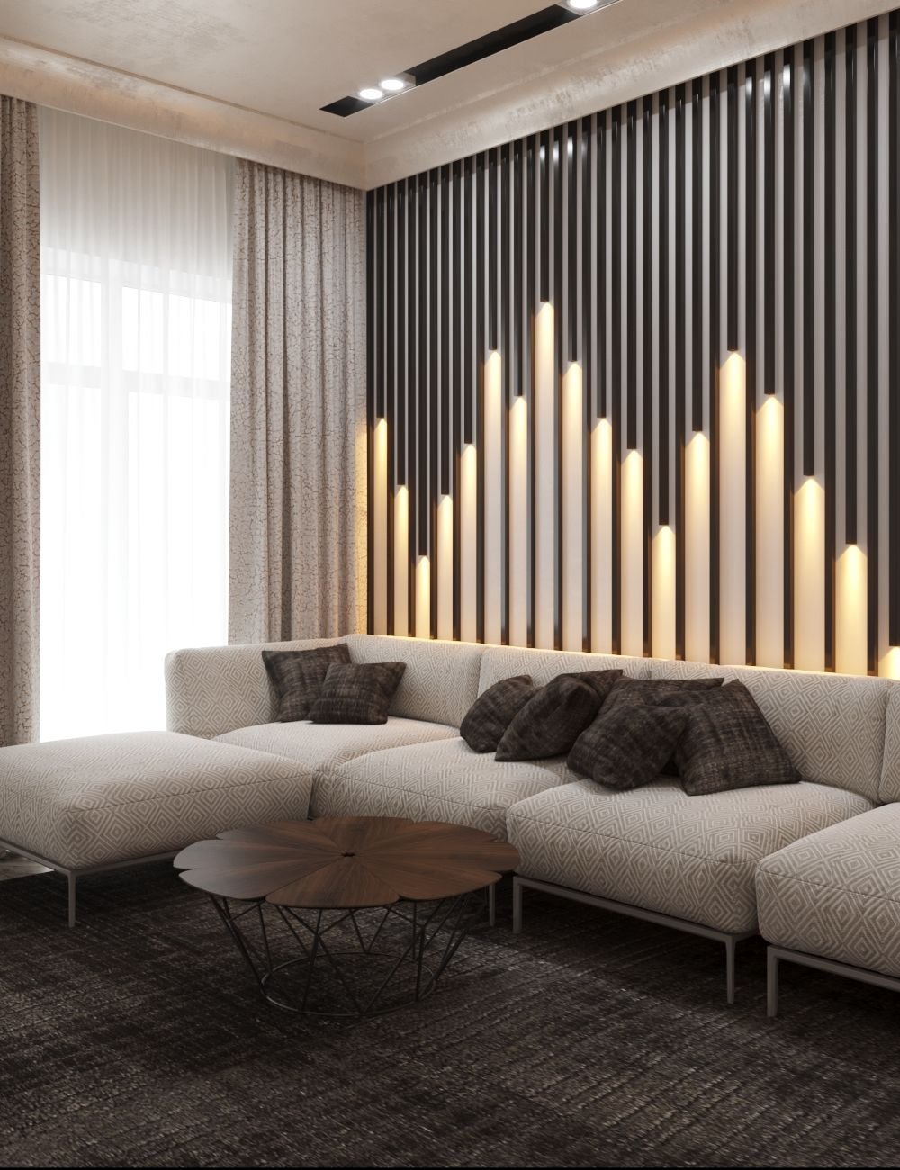 Рейки в интерьере гостиной на стене