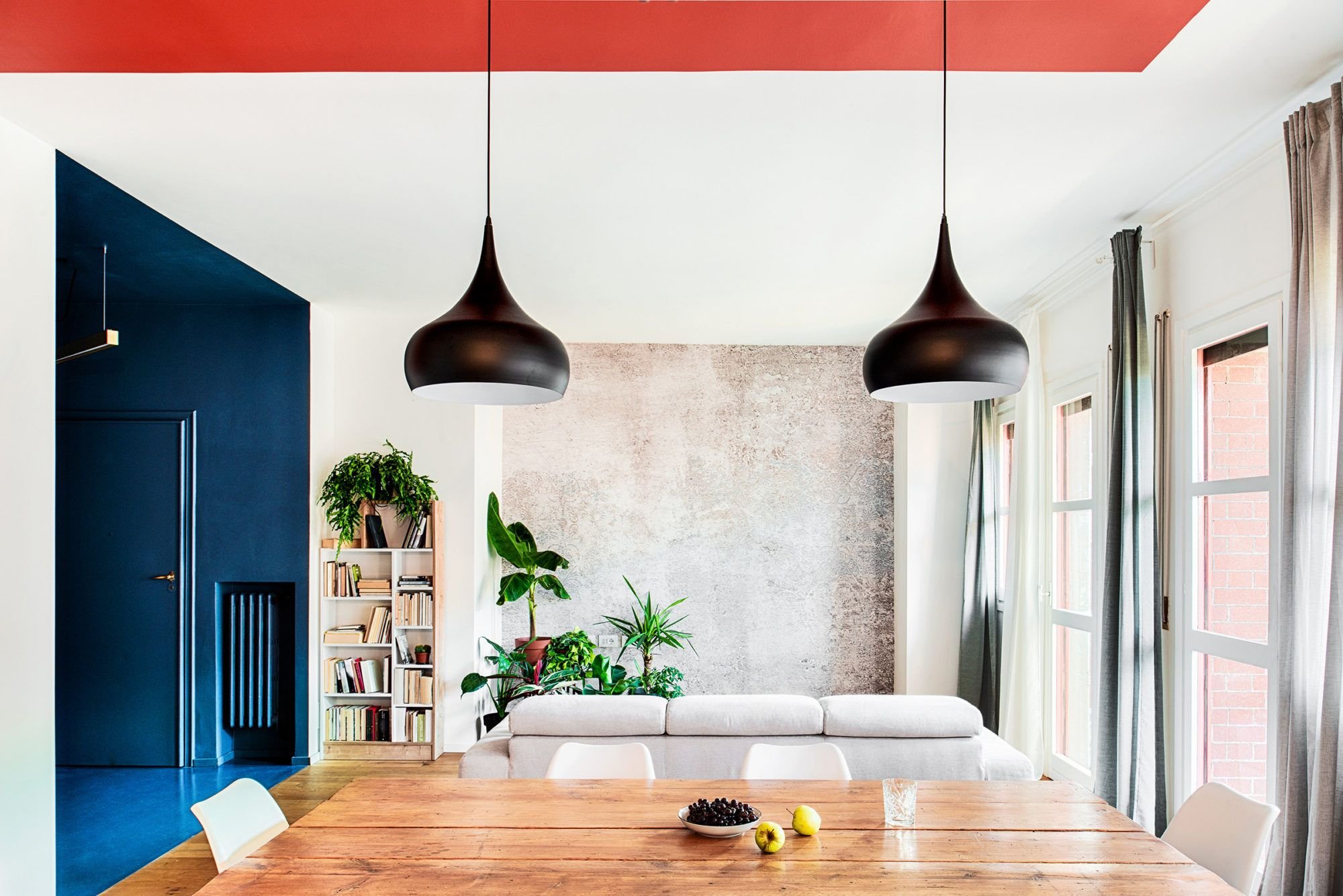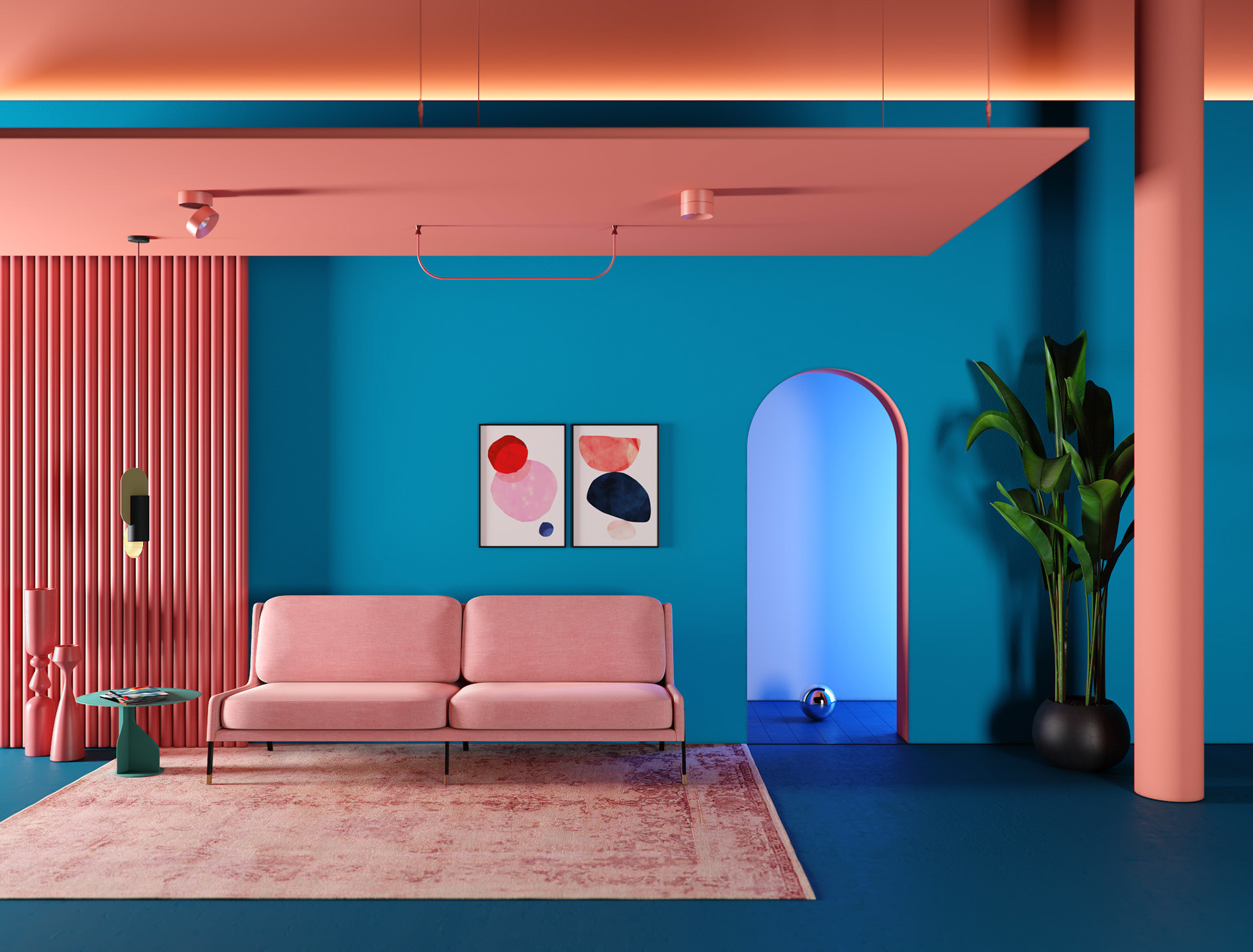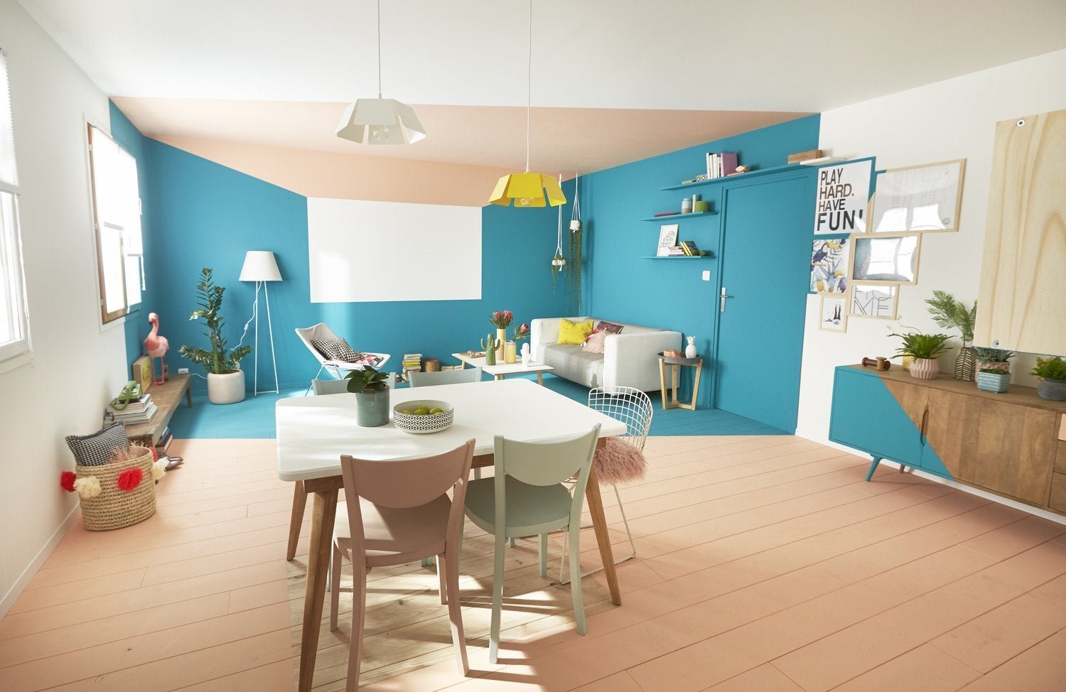 Интерьер колор блокинг синий персик