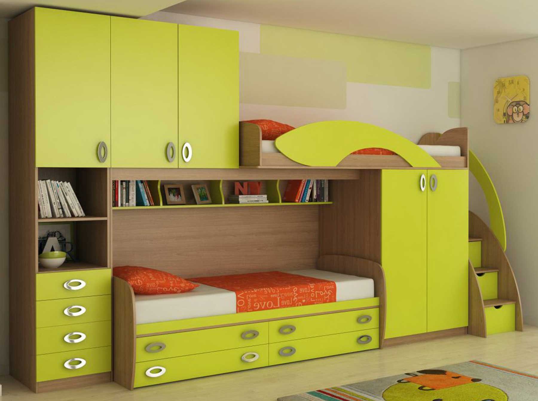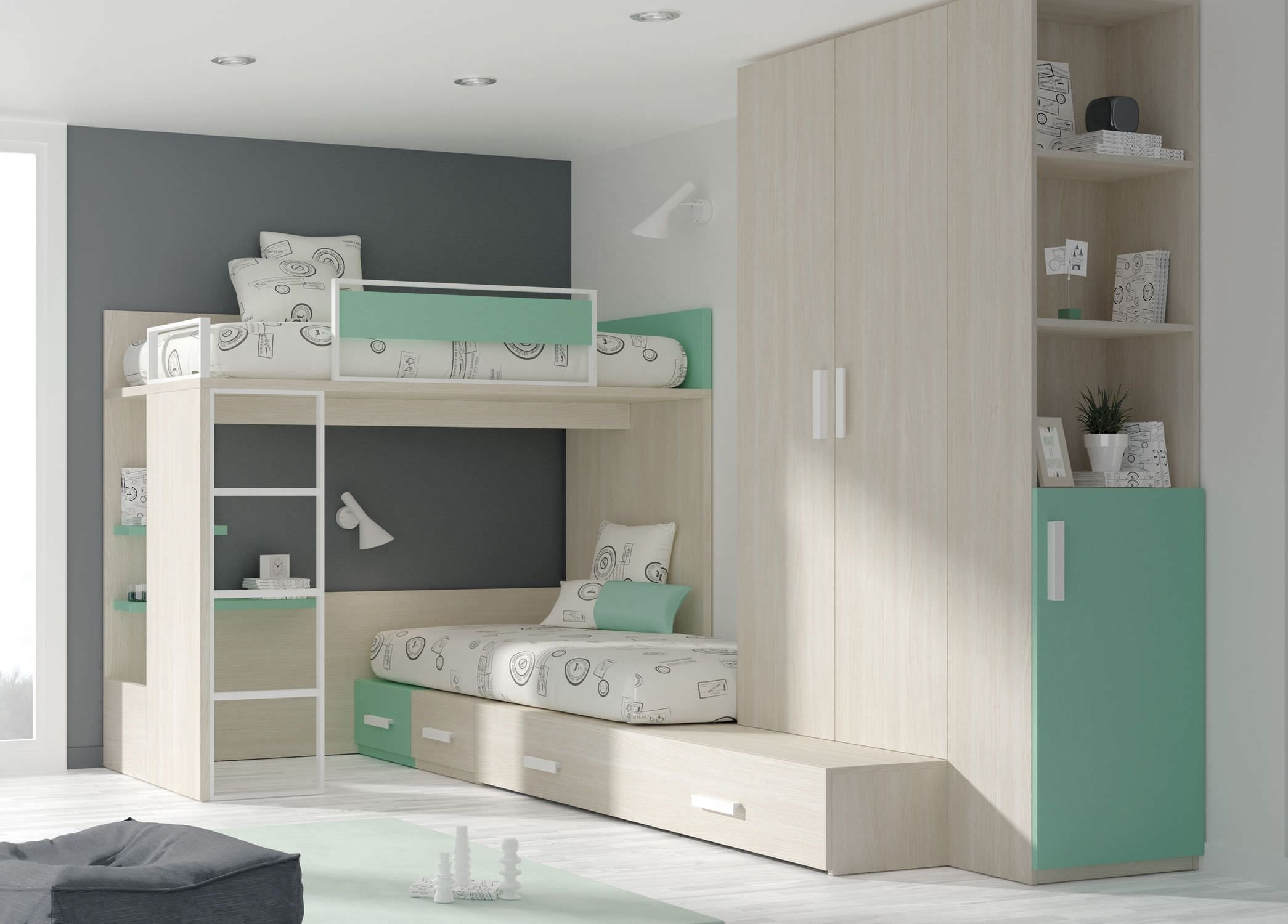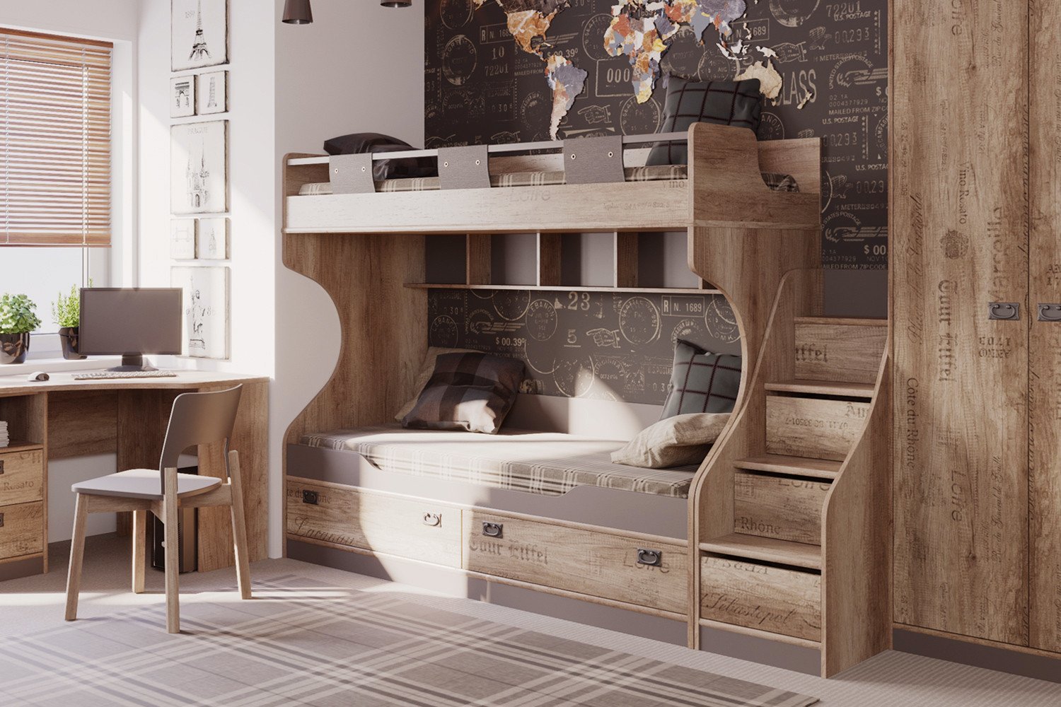 Детская спальня с двухъярусной кроватью и угловым шкафом