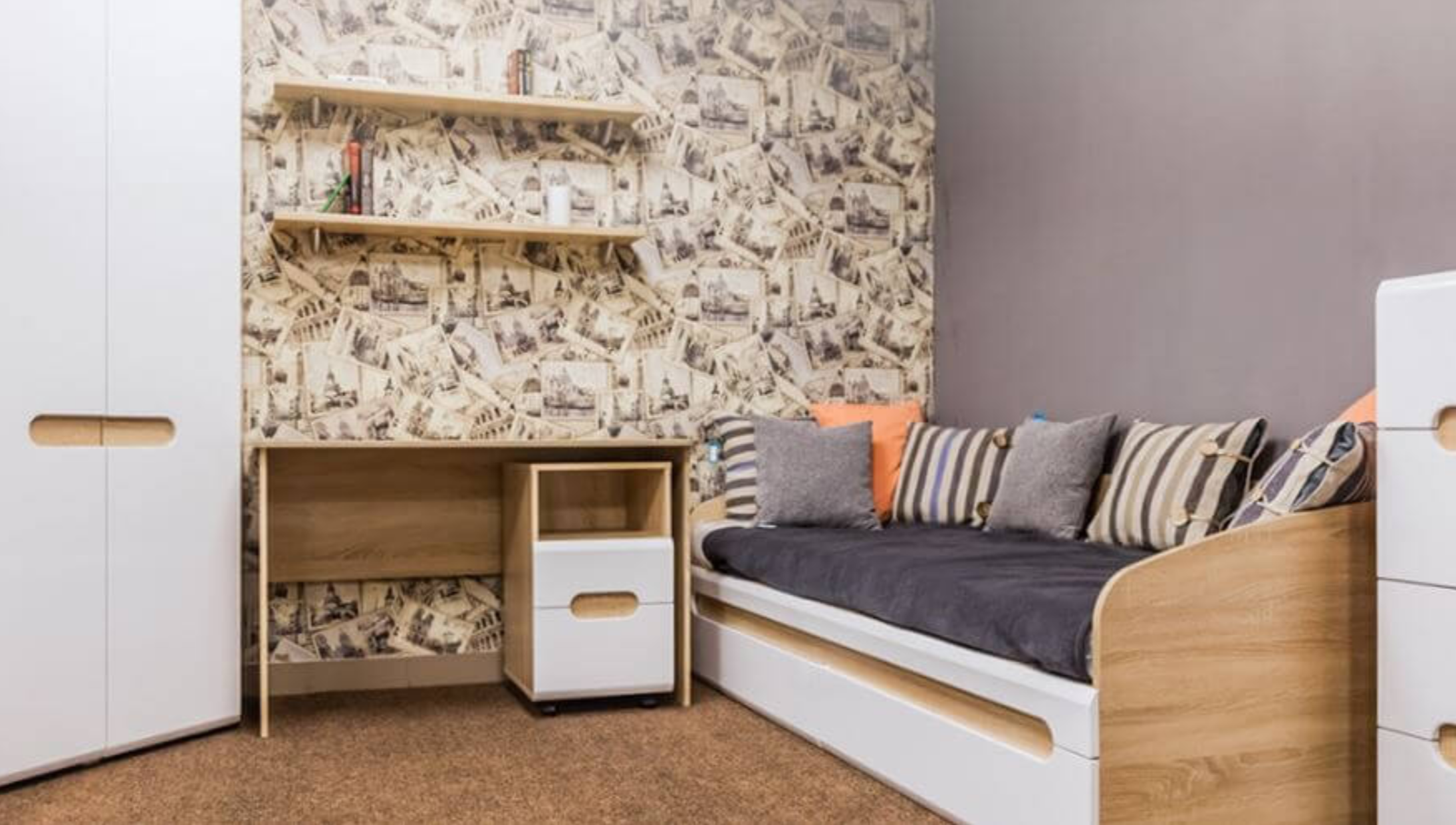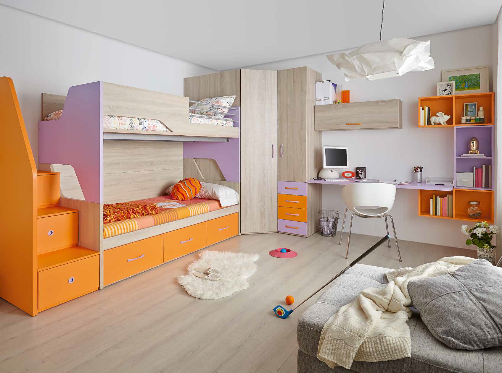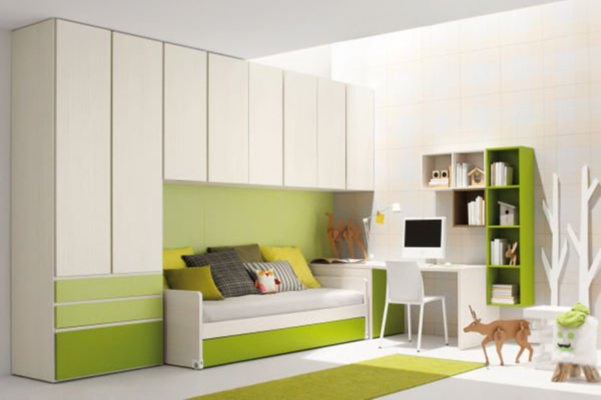 Детская спальня с двухъярусной кроватью и угловым шкафом