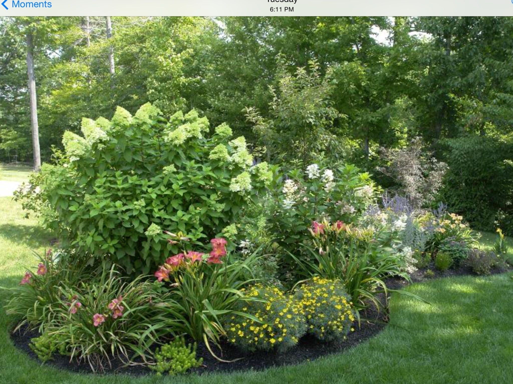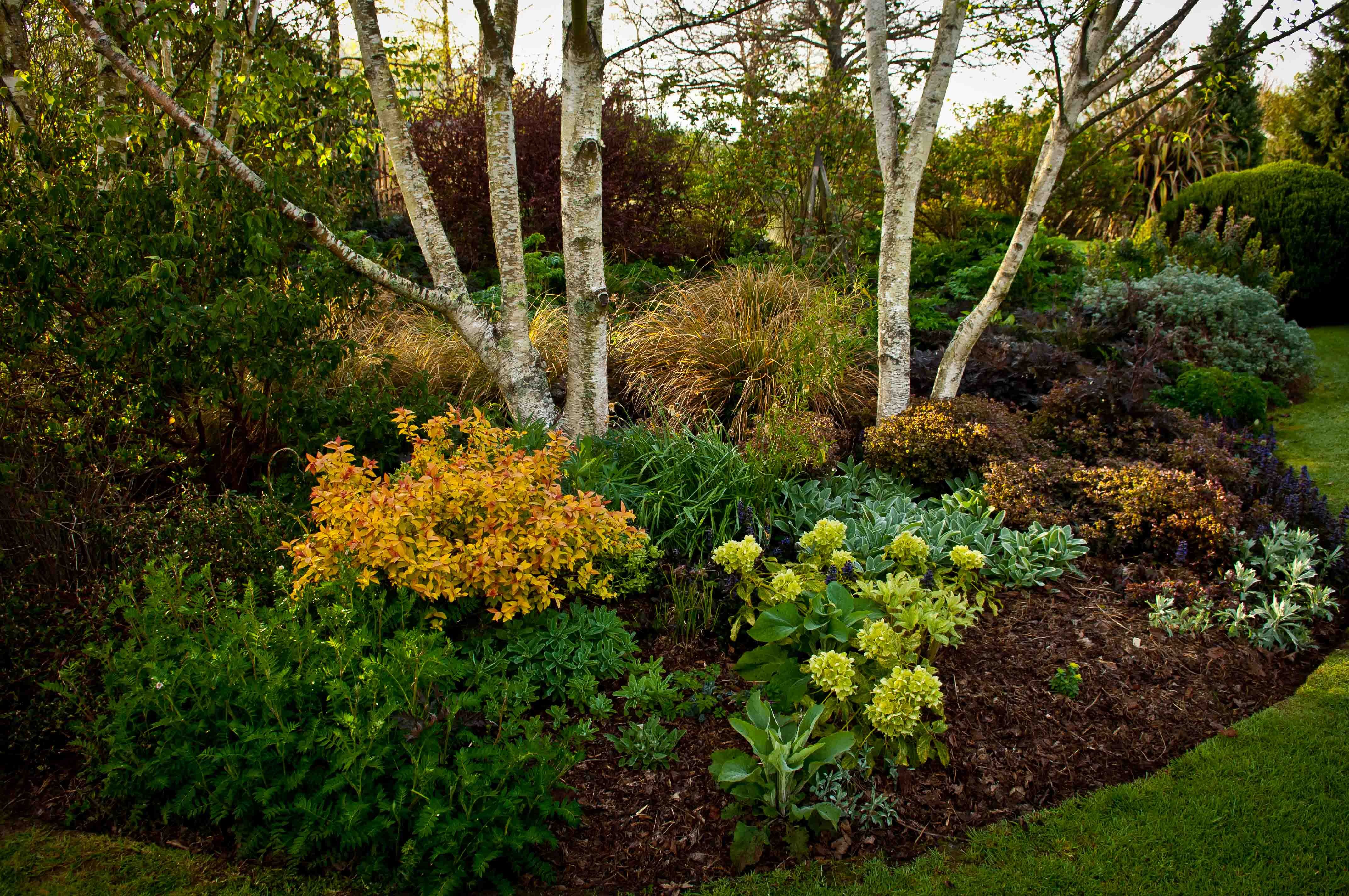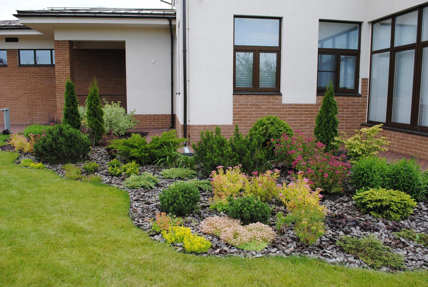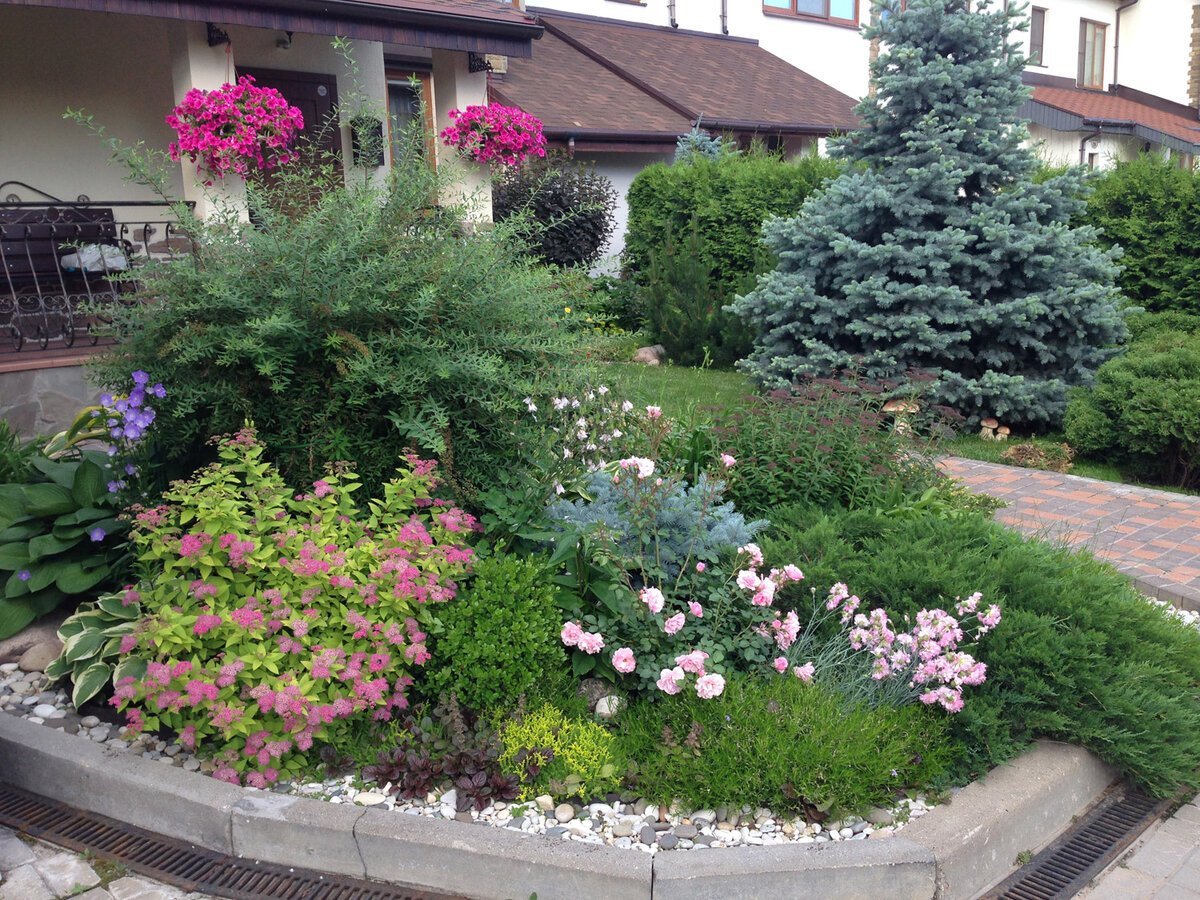Миксбордер с елью и спиреей