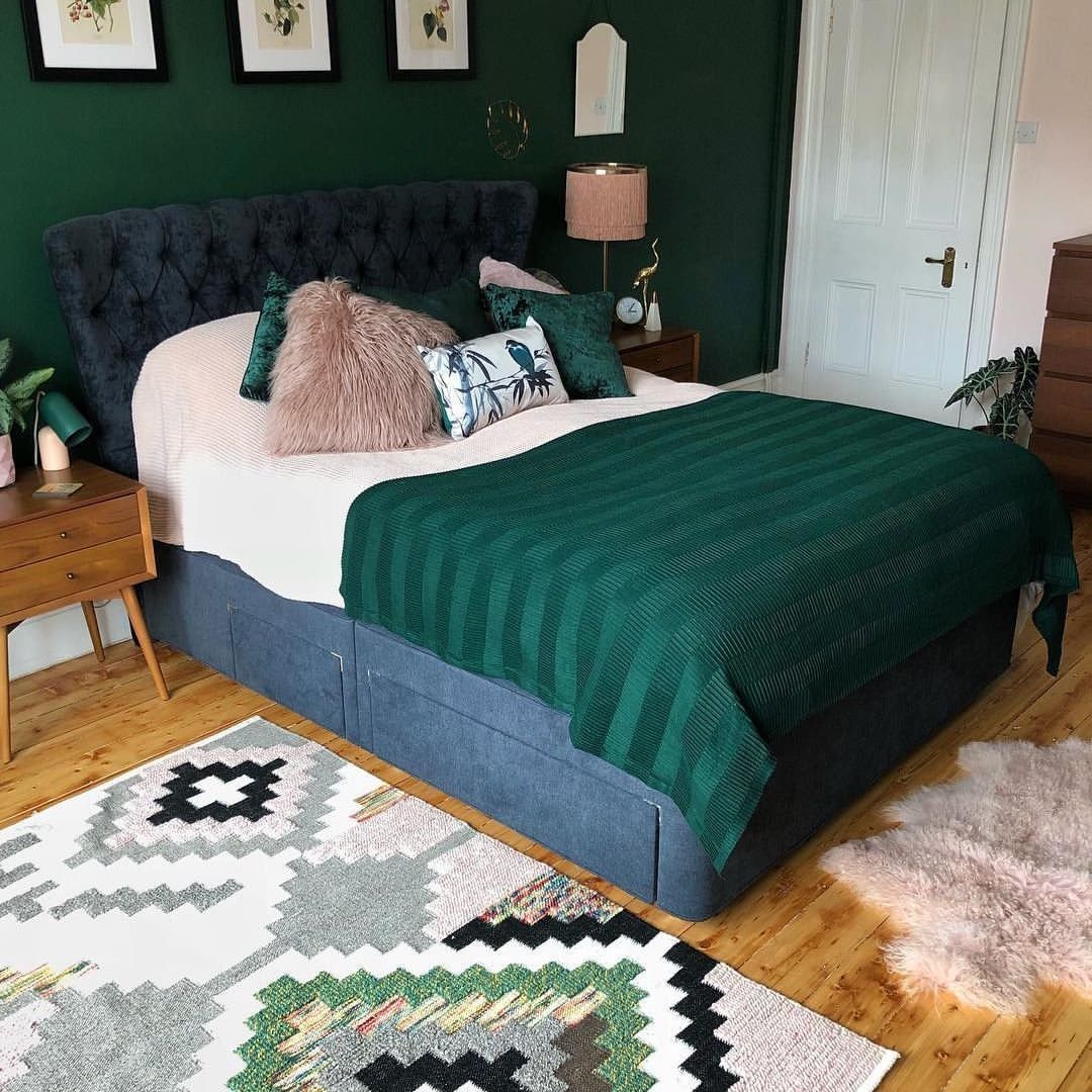 Кровать изумрудного цвета в интерьере