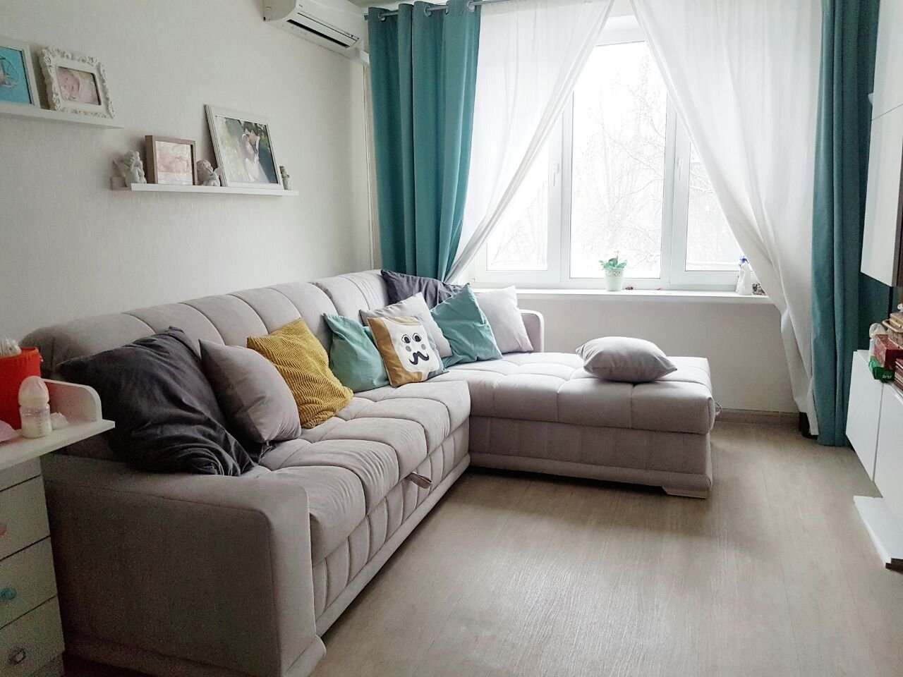 Диван у окна в узкой комнате