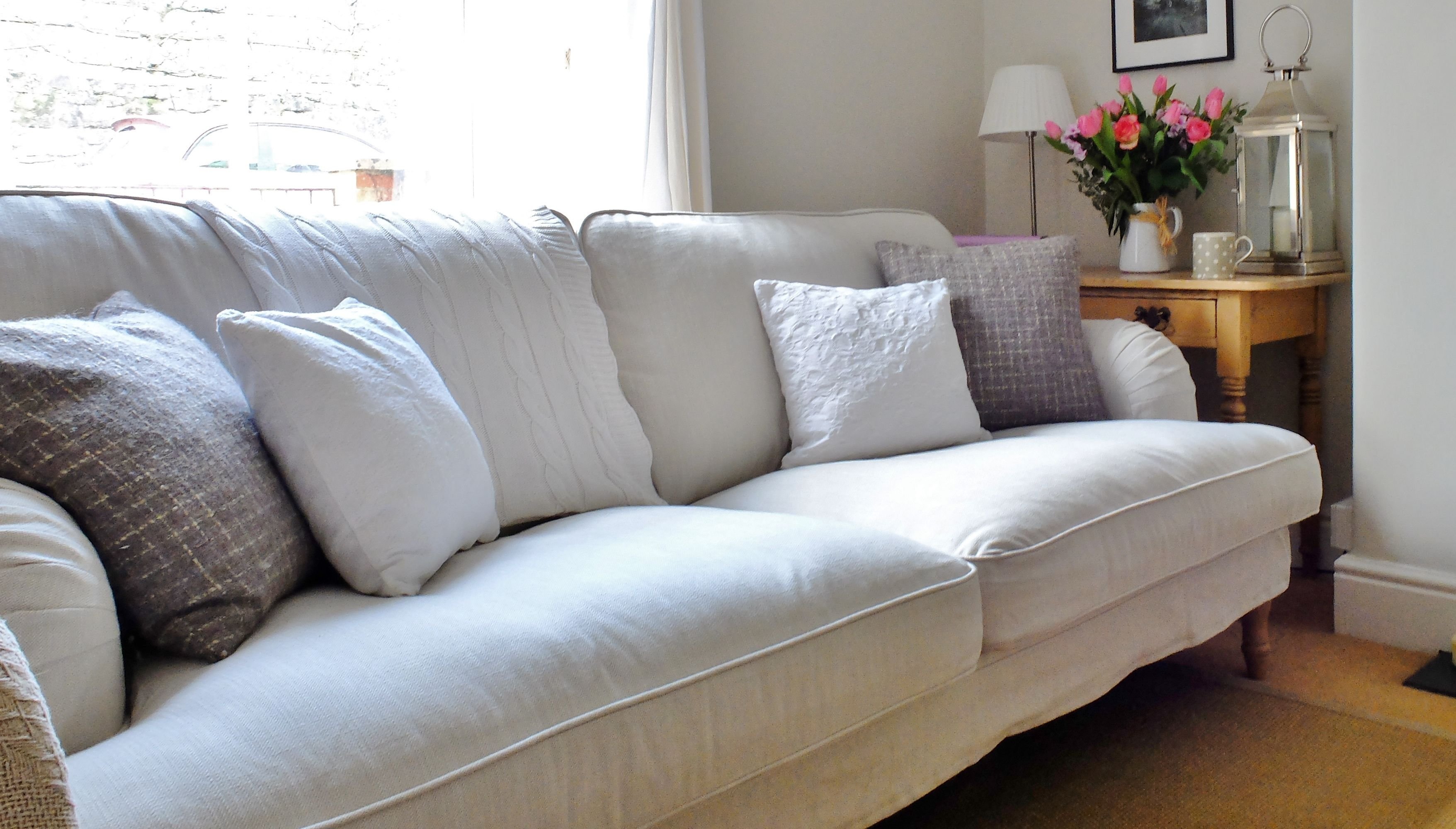 Перетяжка дивана с большими подушками
