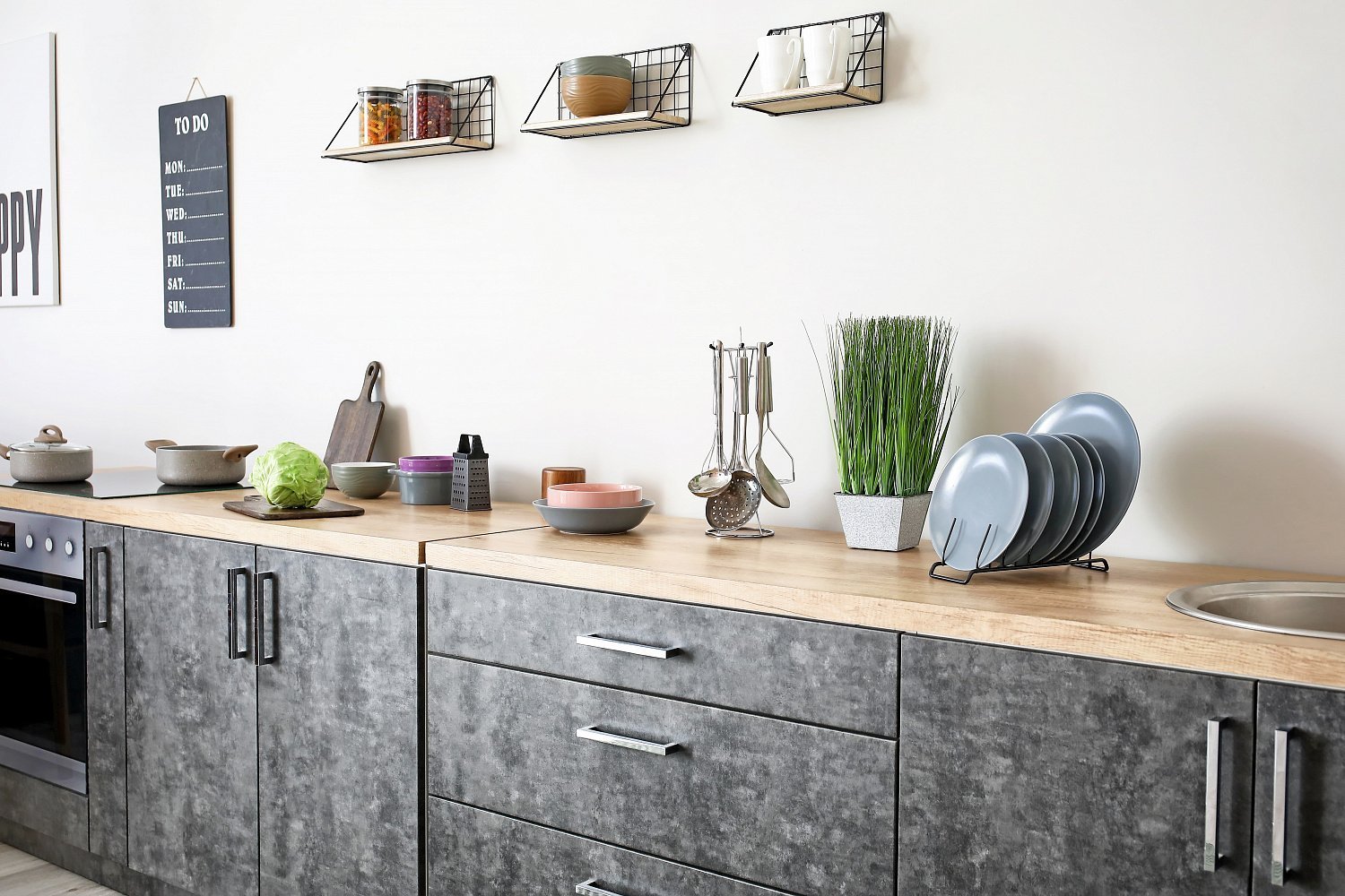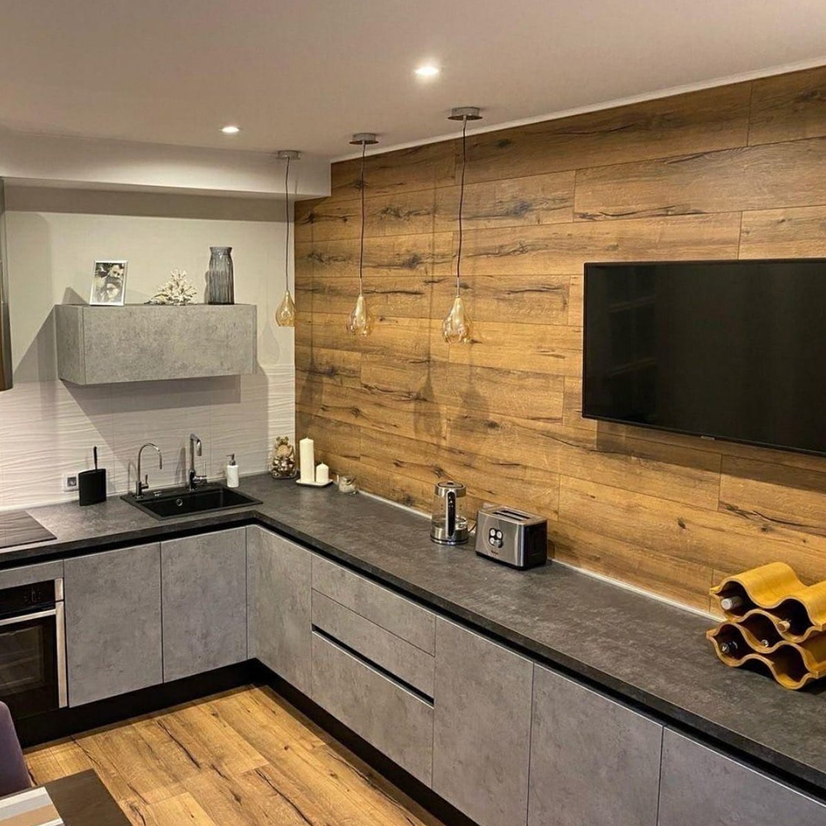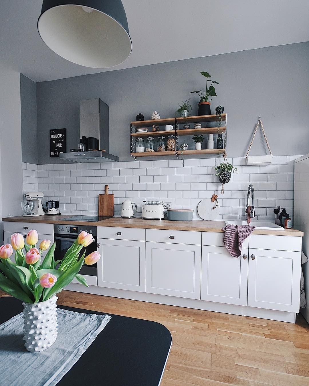 Кухня в скандинавском стиле с деревянной столешницей