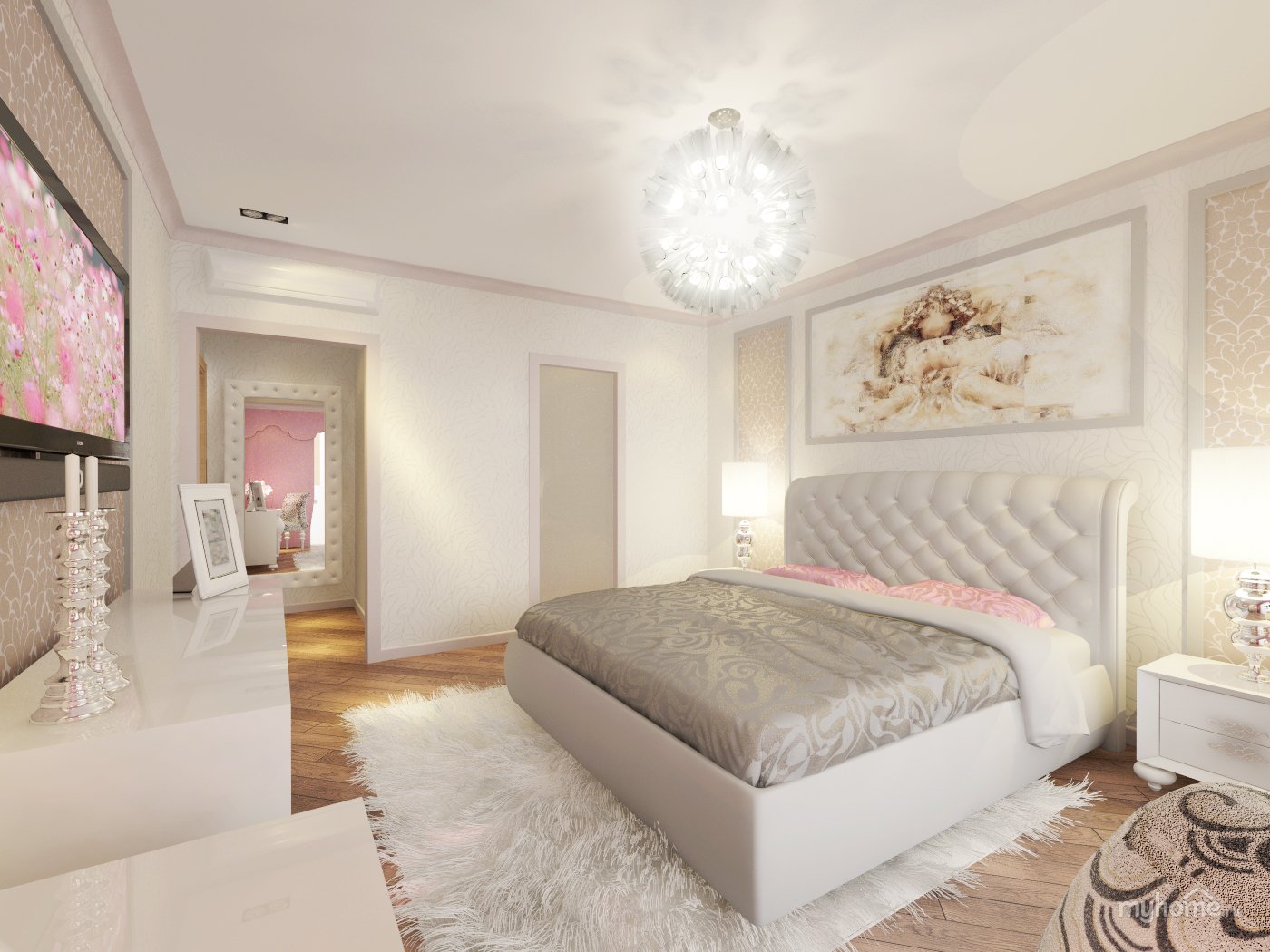 Спальни белый бежевый розовый