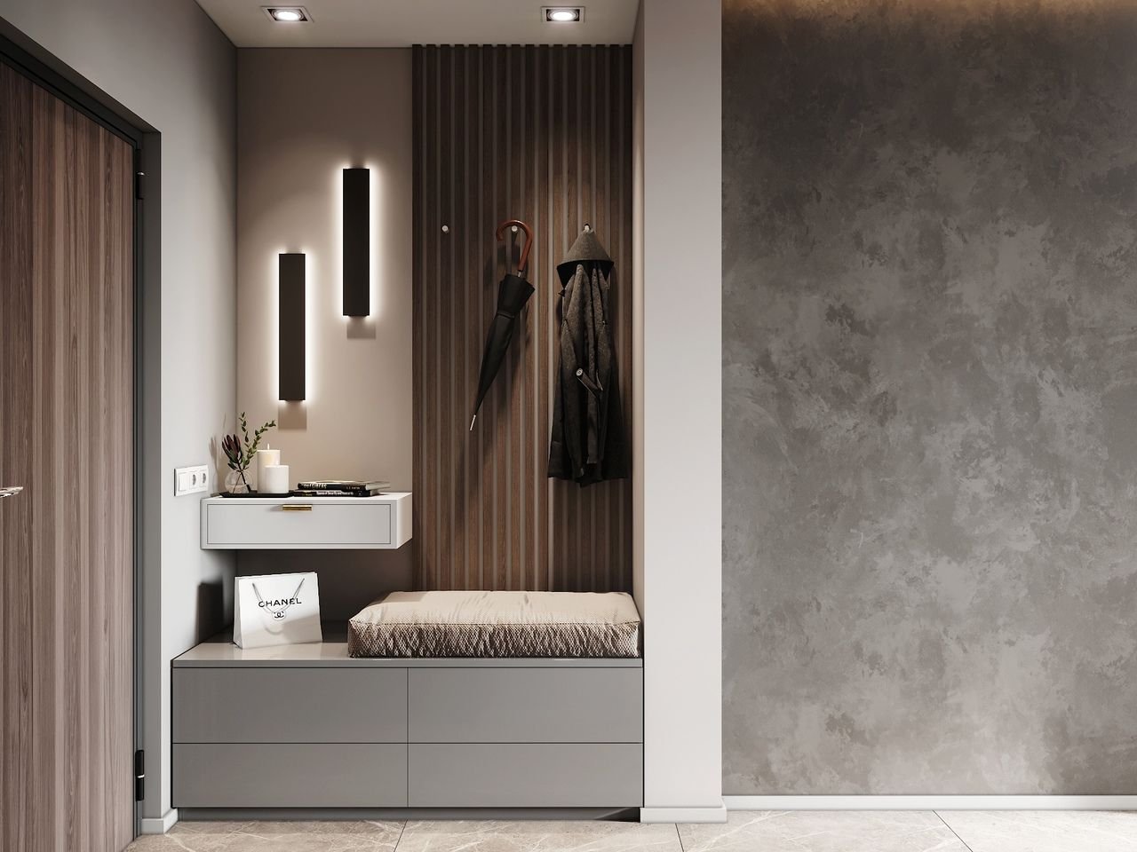 Прихожая с деревянными рейками