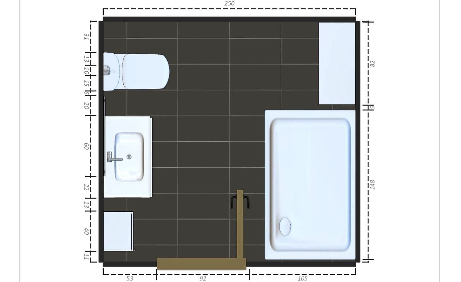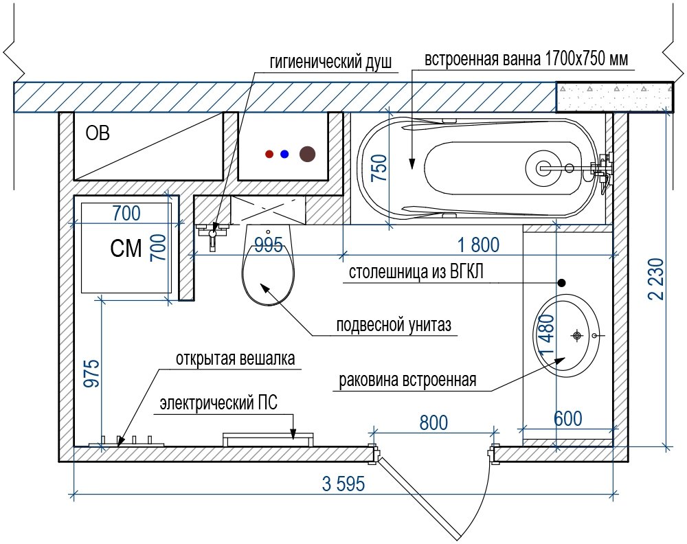 Санузел 4 кв м 2,5х1,5 с душевой кабиной