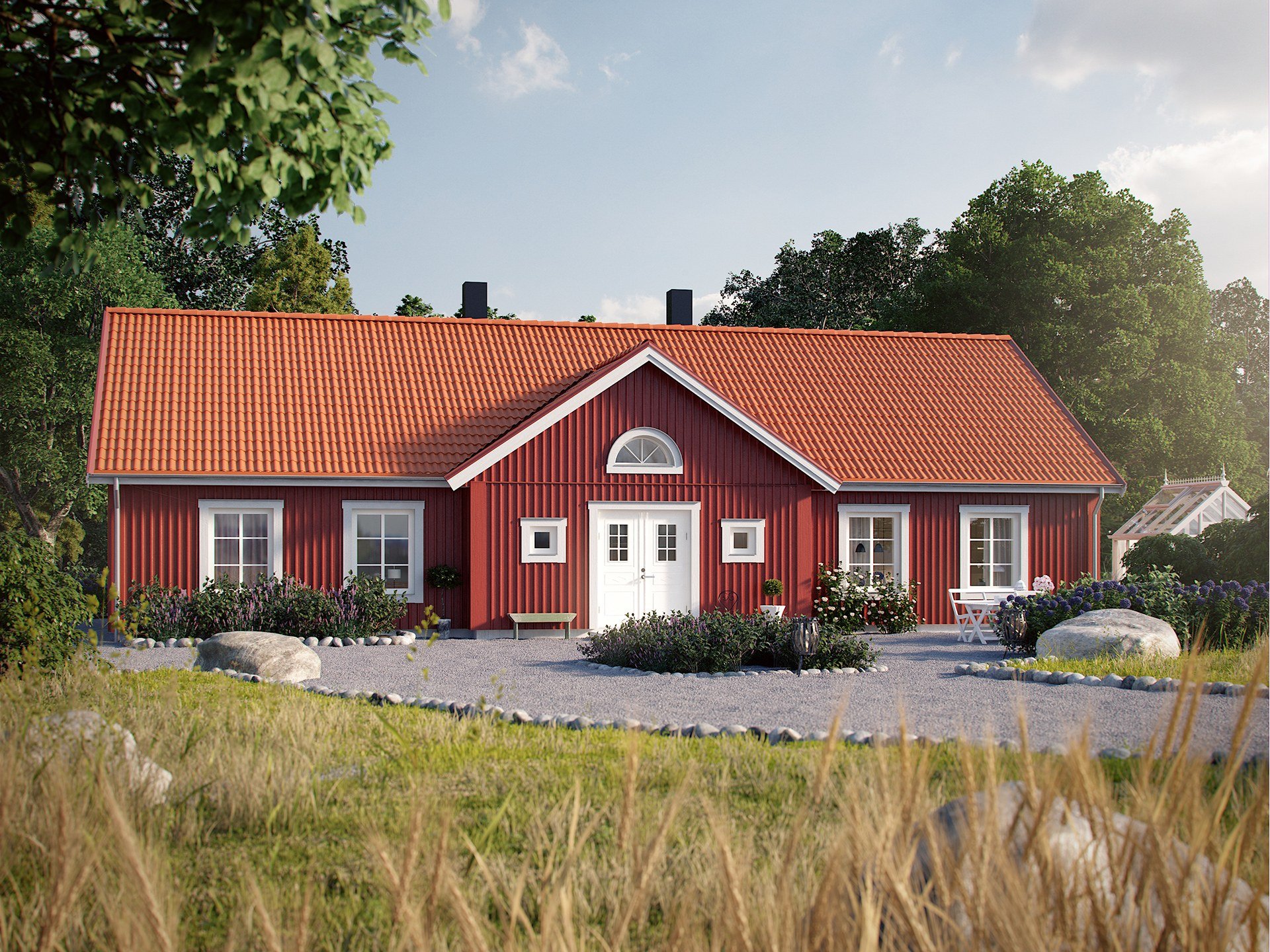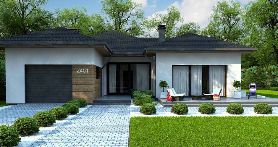 Одноэтажный дом с красивым садом