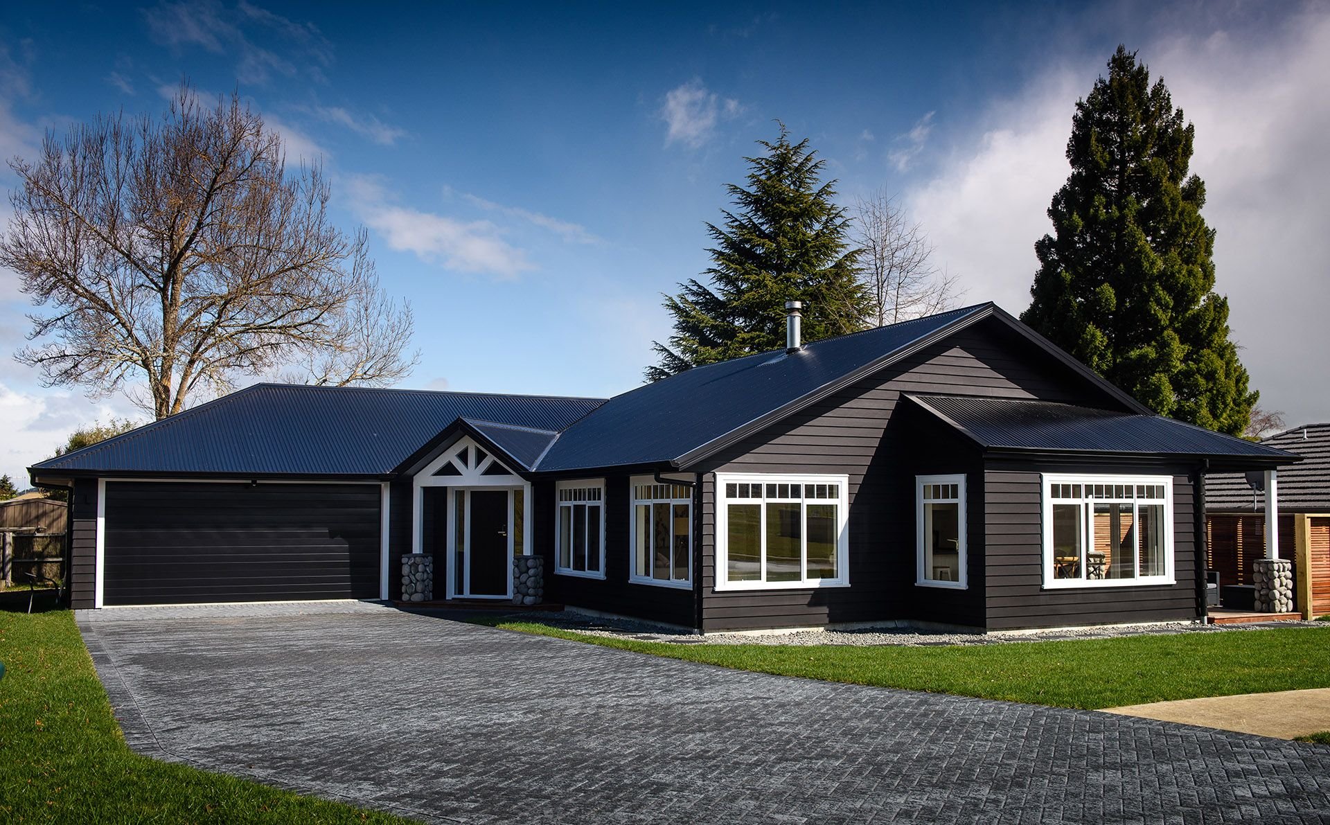 Белый одноэтажный дом с черной крышей