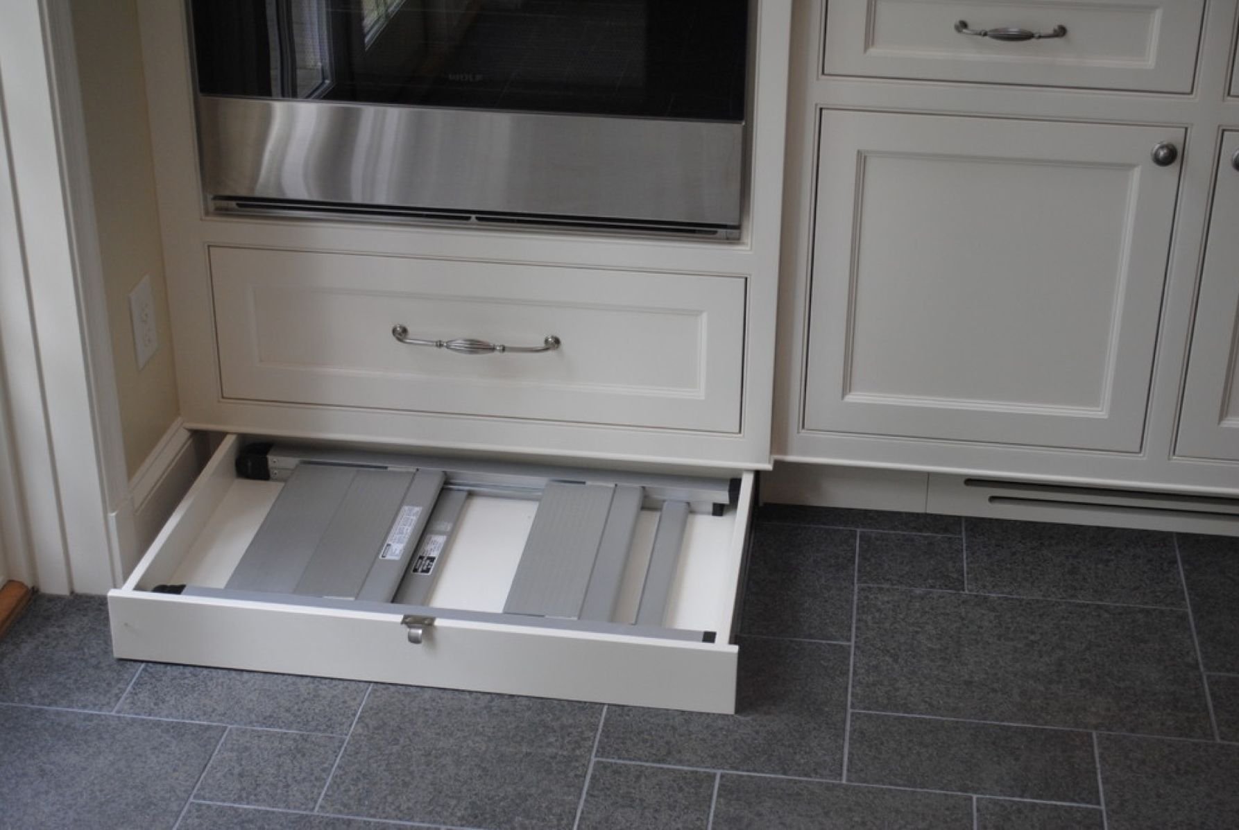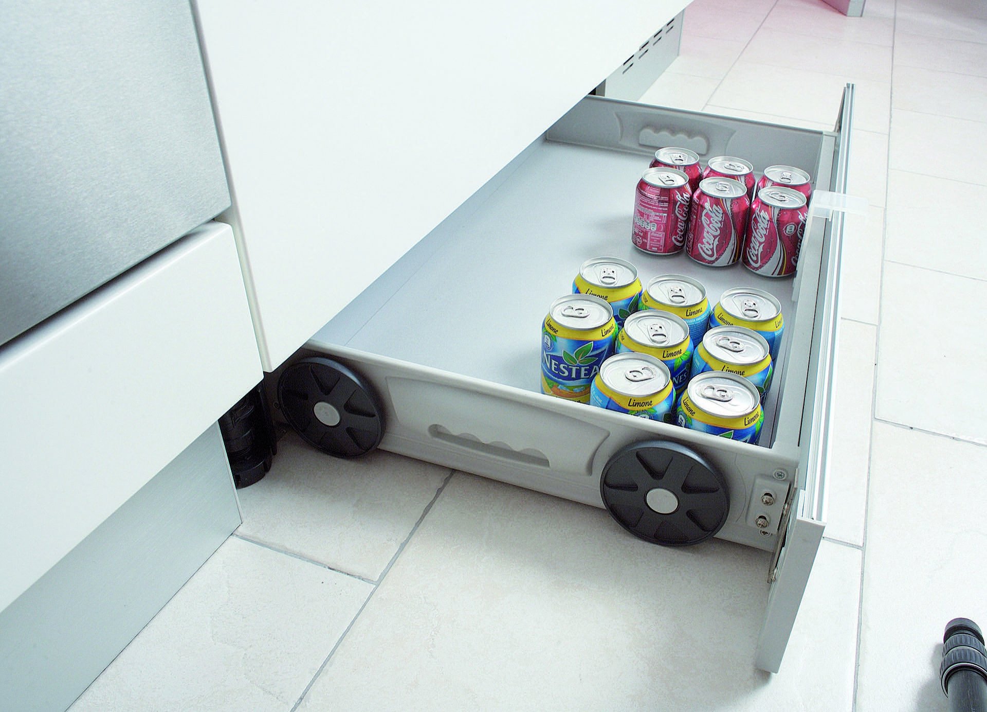 Выдвижные ящики в цоколе кухни