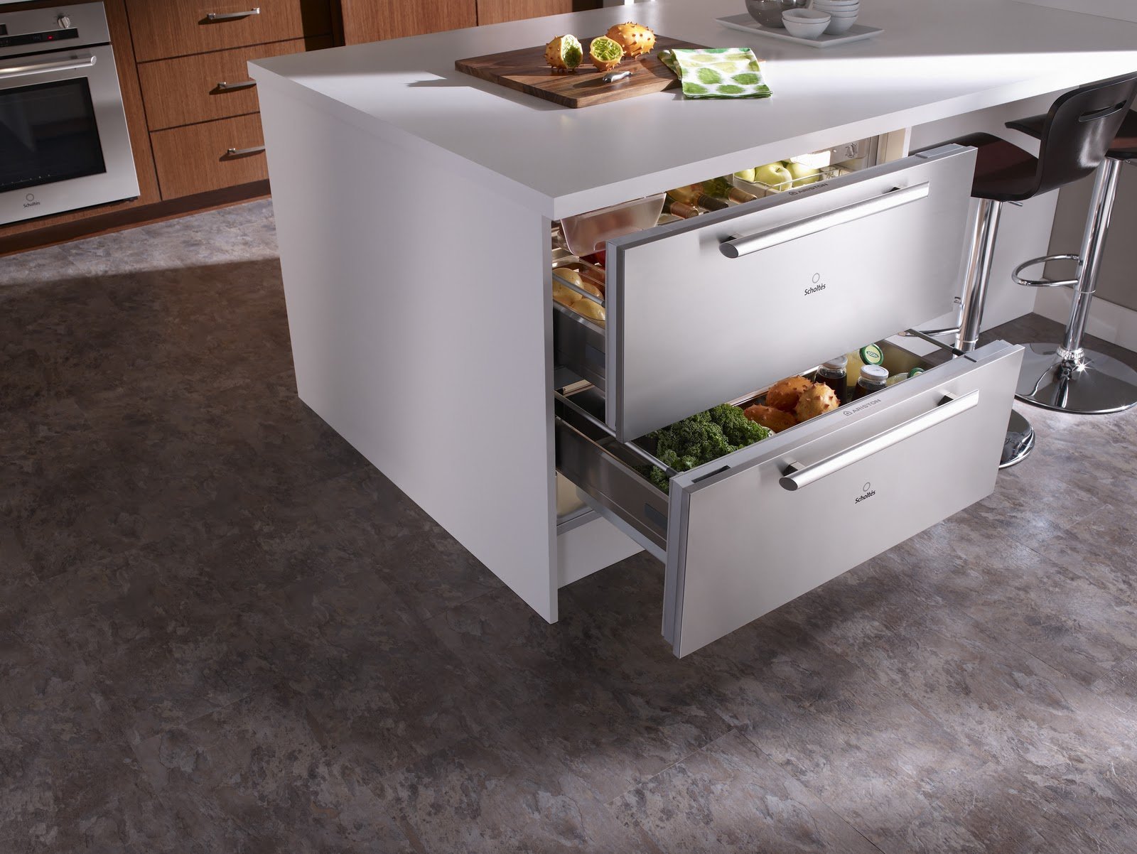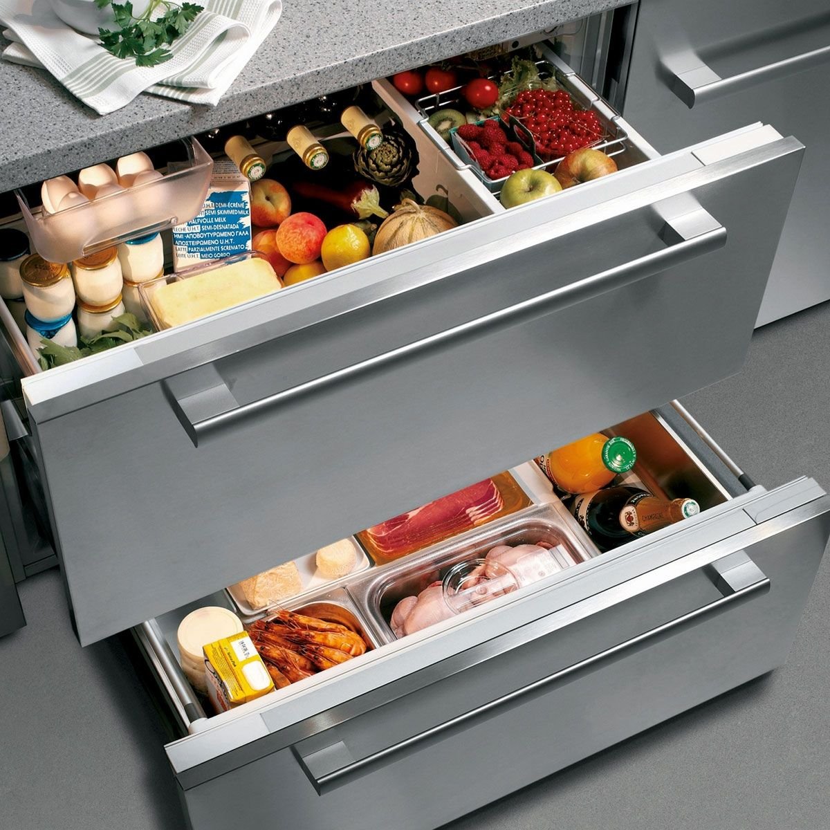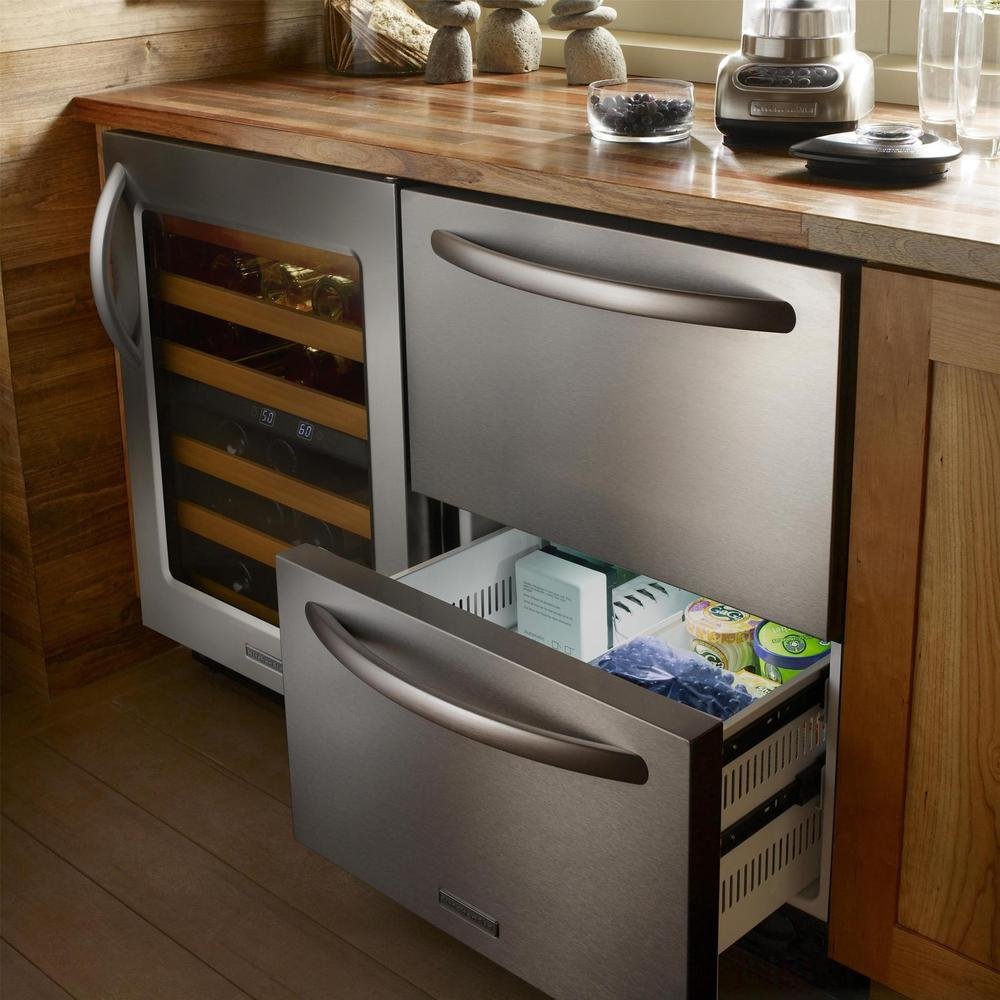 Холодильник встраиваемый под столешницу с выдвижными ящиками