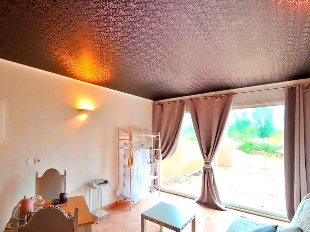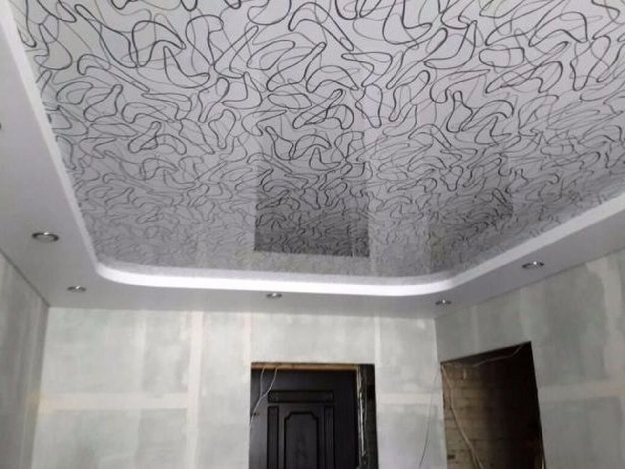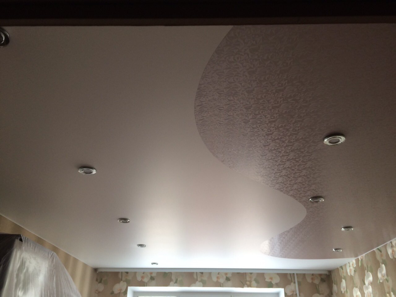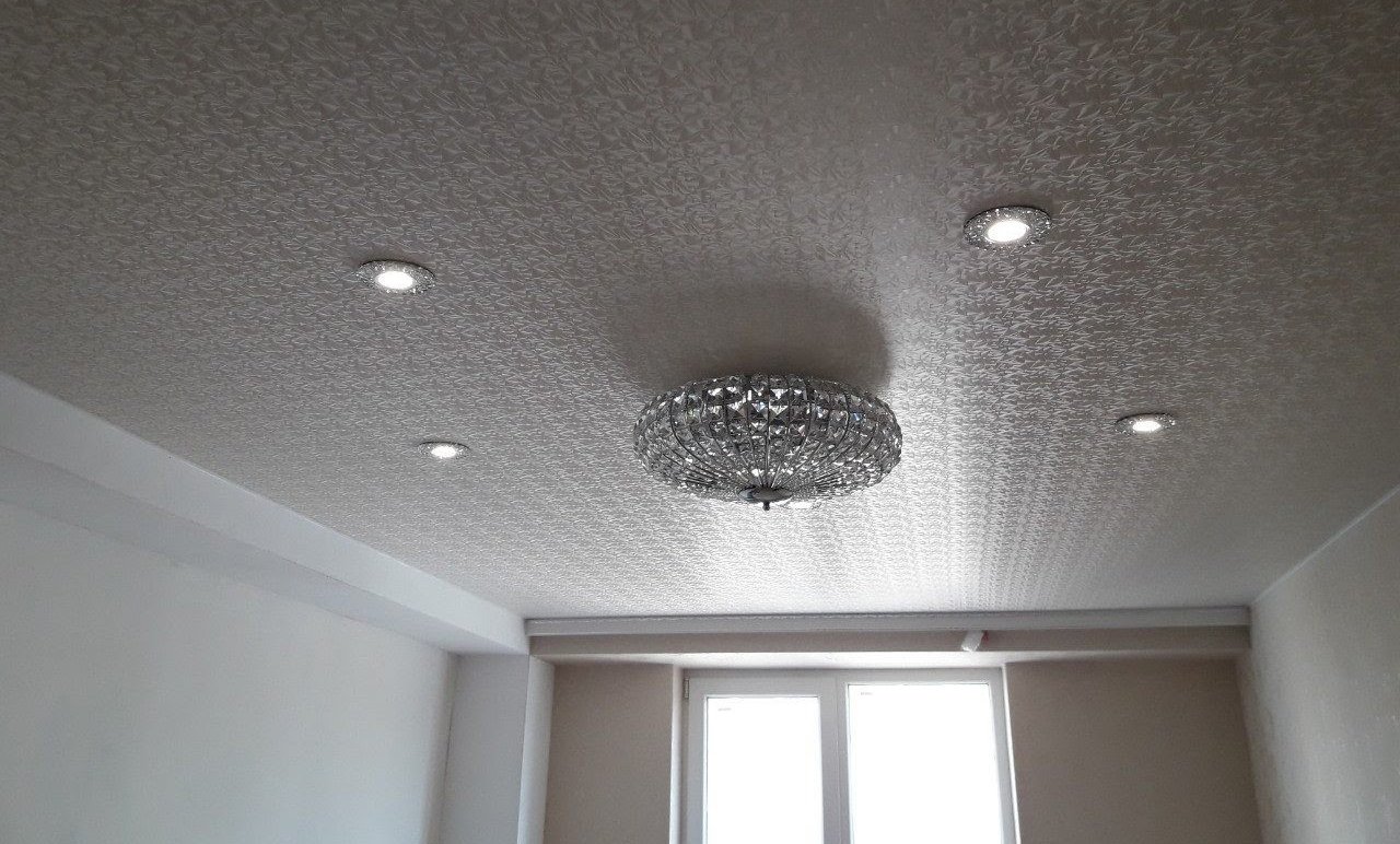 Фактурный натяжной потолок в интерьере