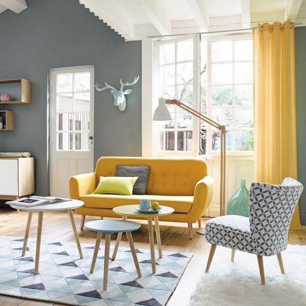 Интерьер серый зеленый желтый Сканди