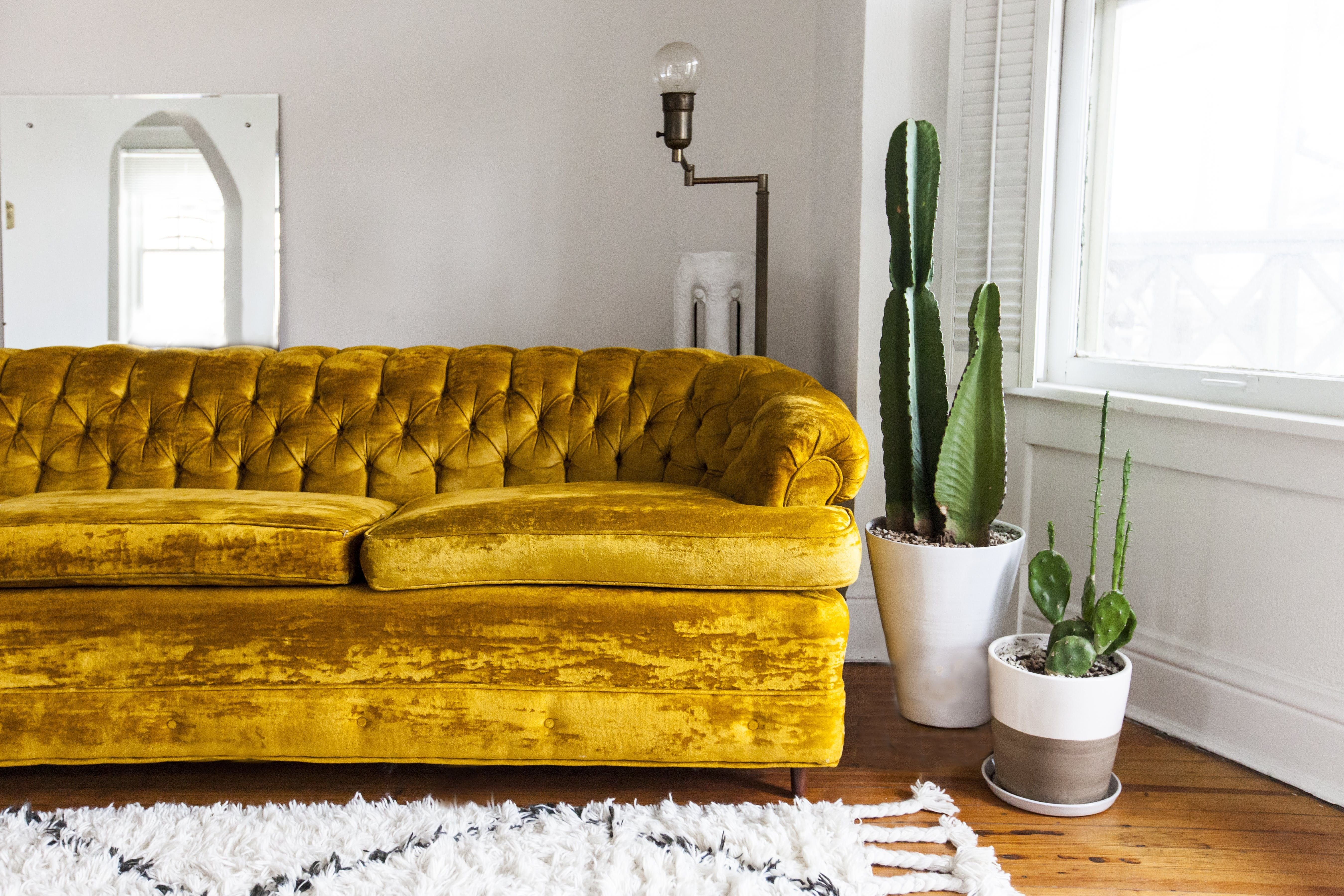 Желтый велюровый диван