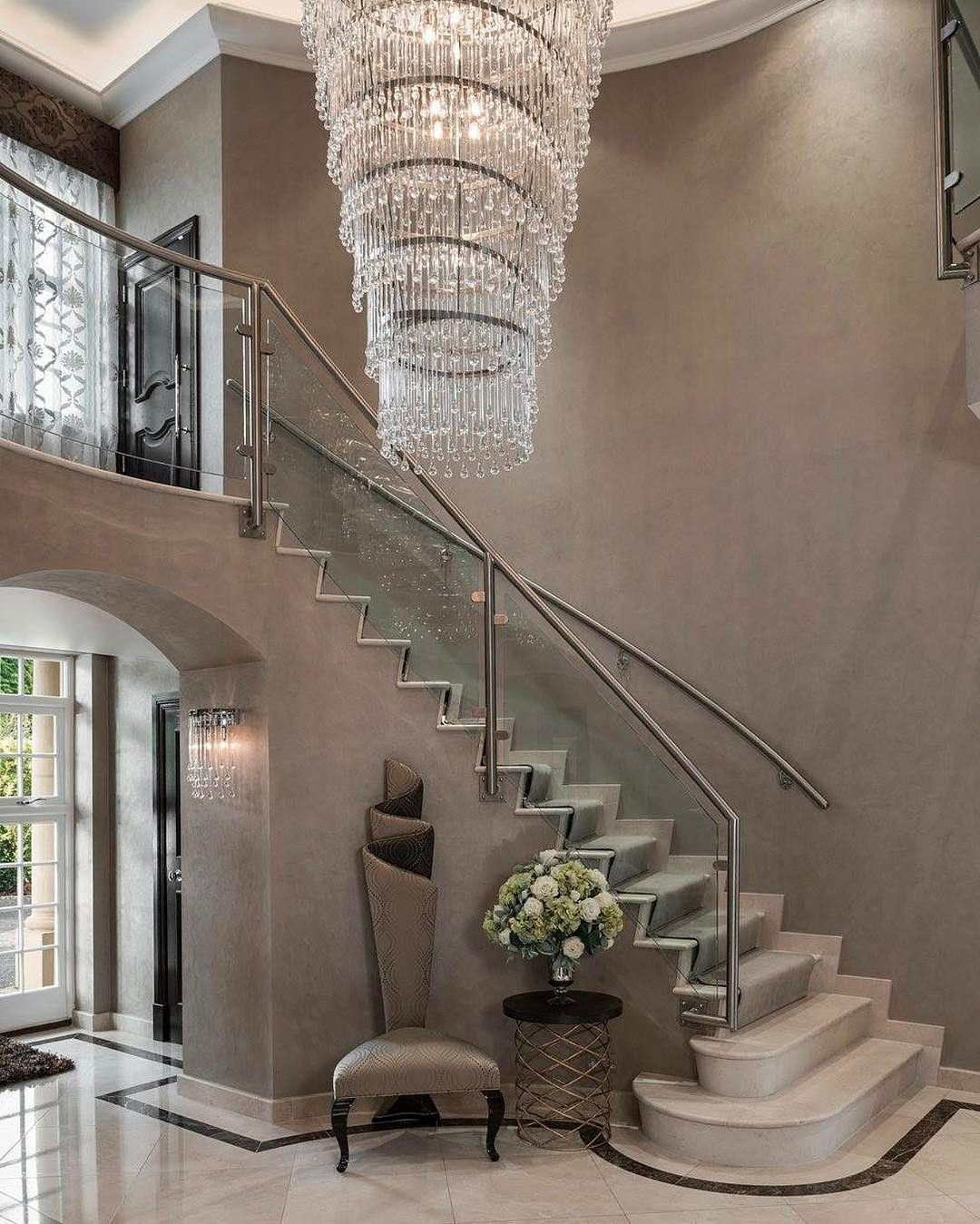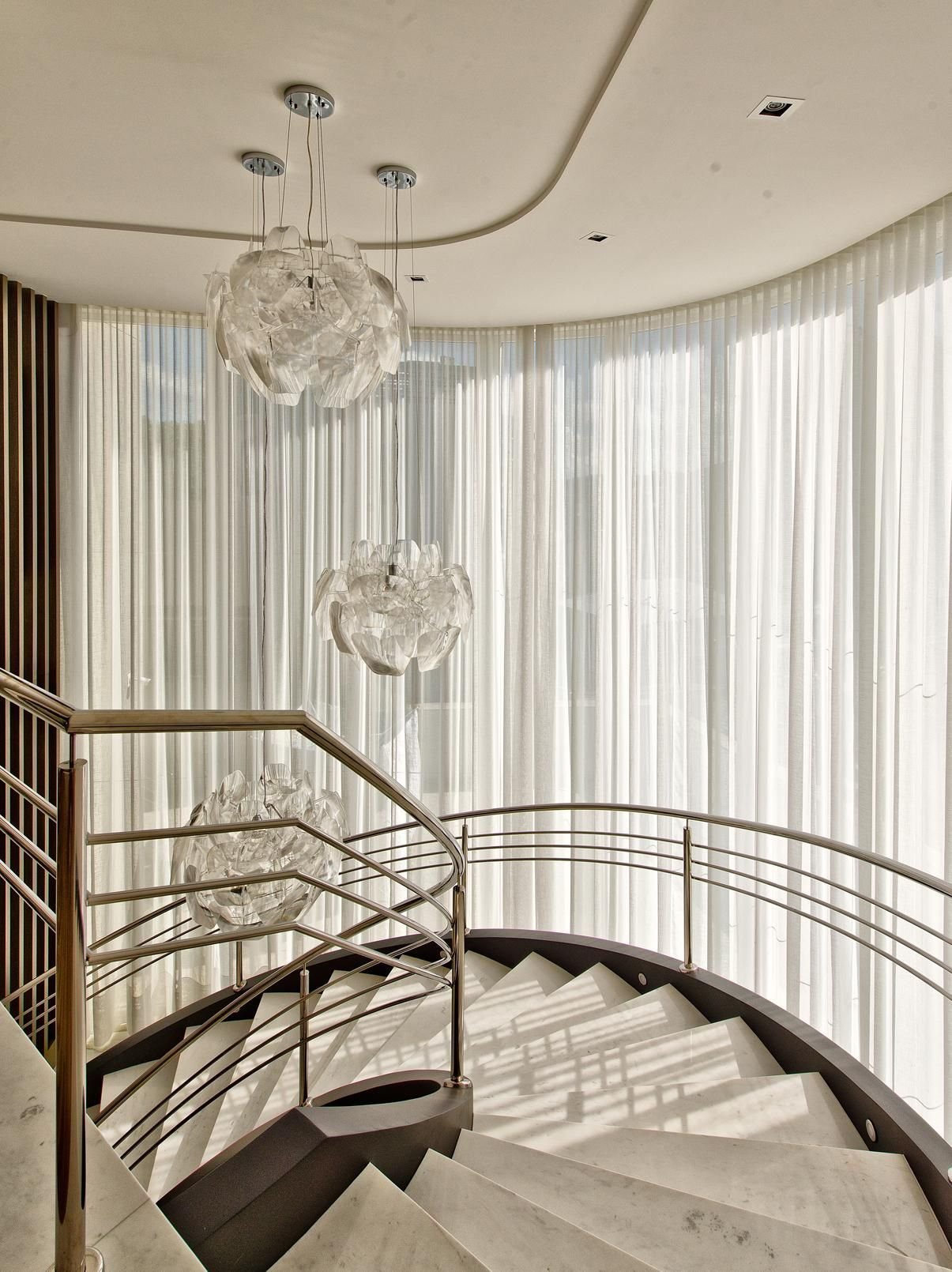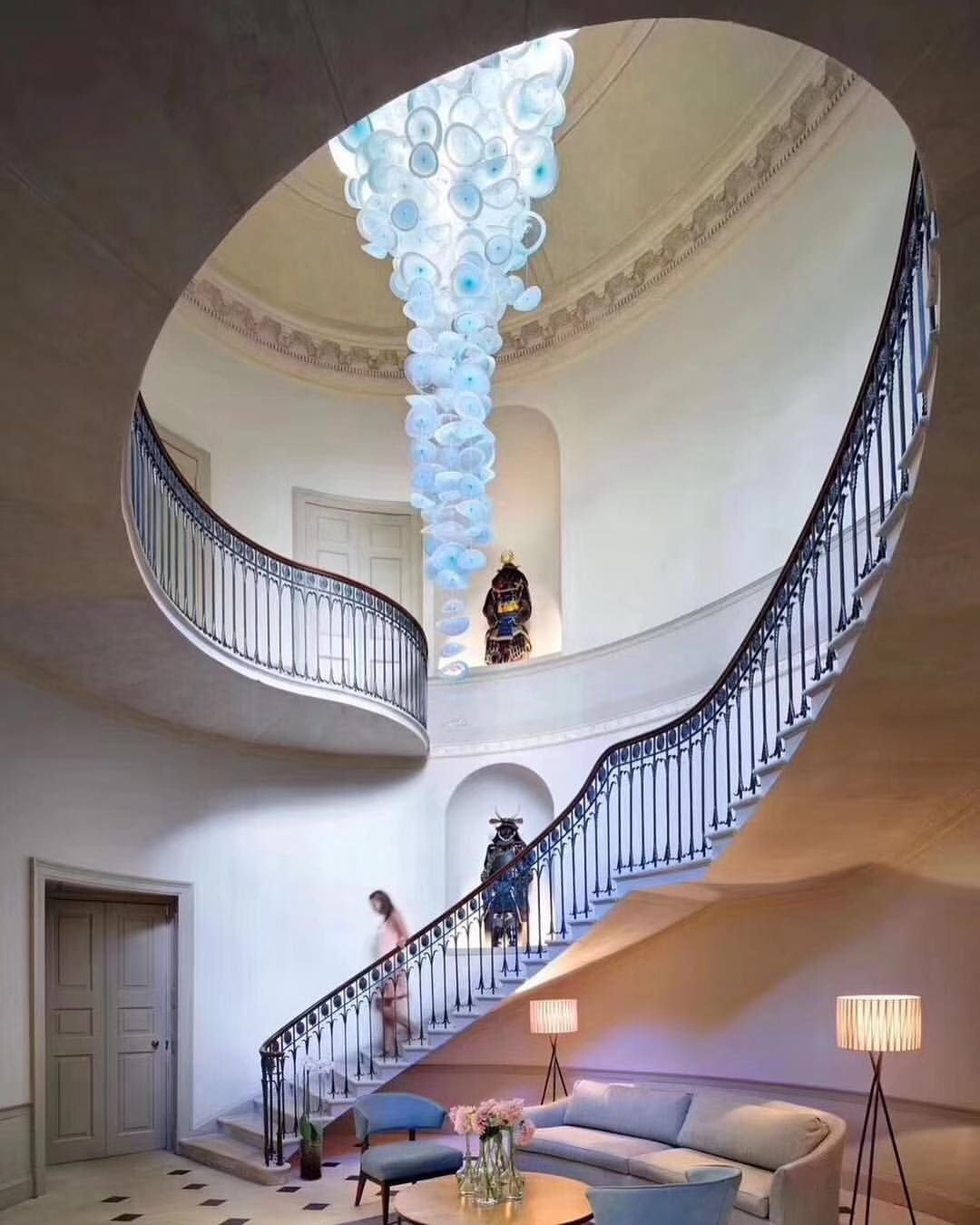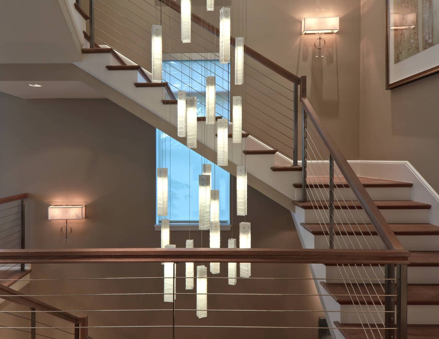 Люстры между этажами над лестницей красивые