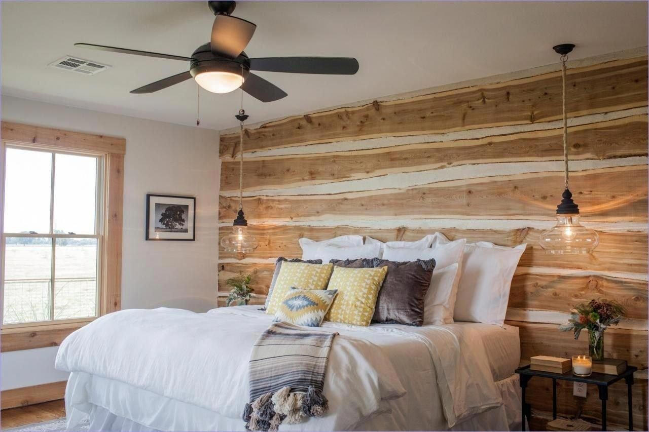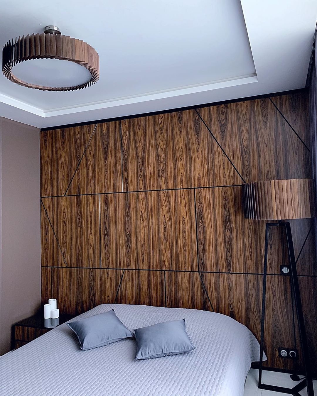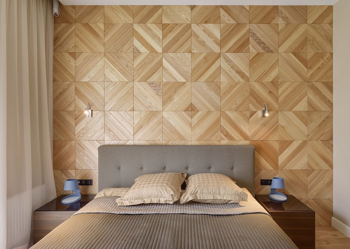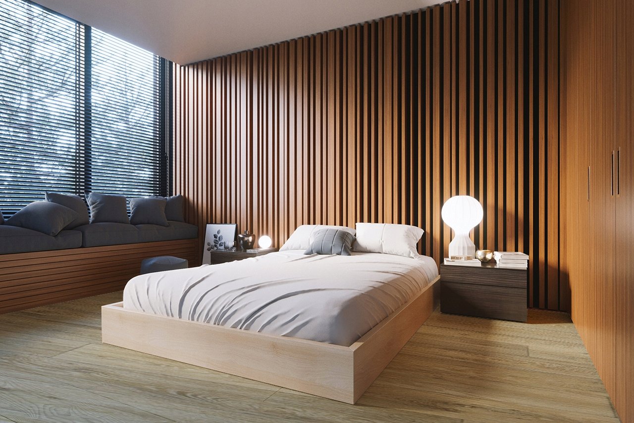 Спальня с деревянными рейками на стене