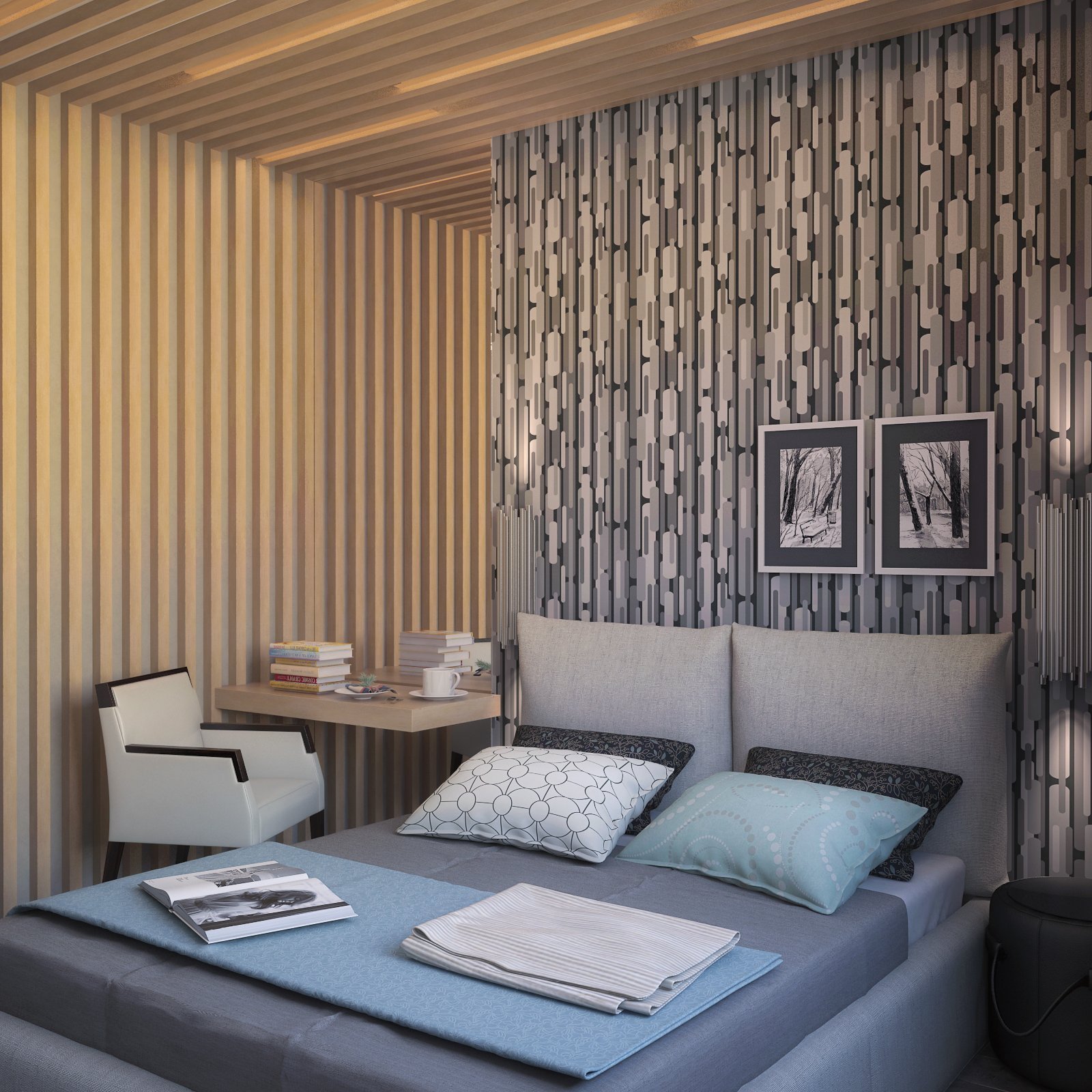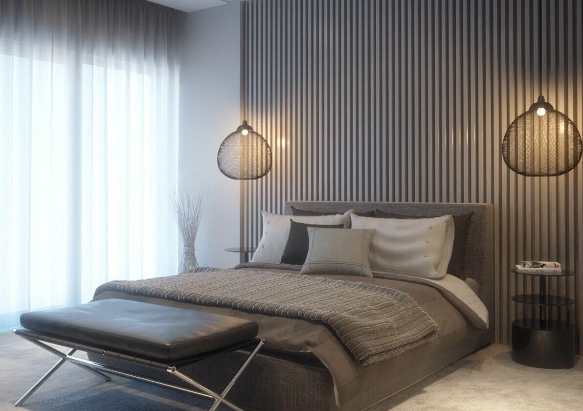 Рейки на стене в интерьере спальни