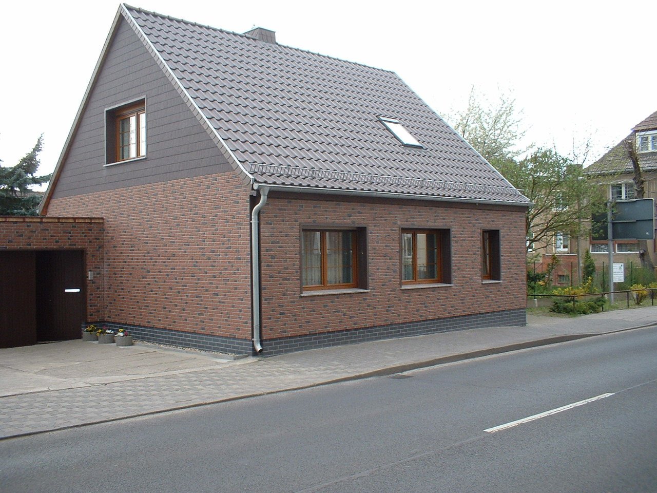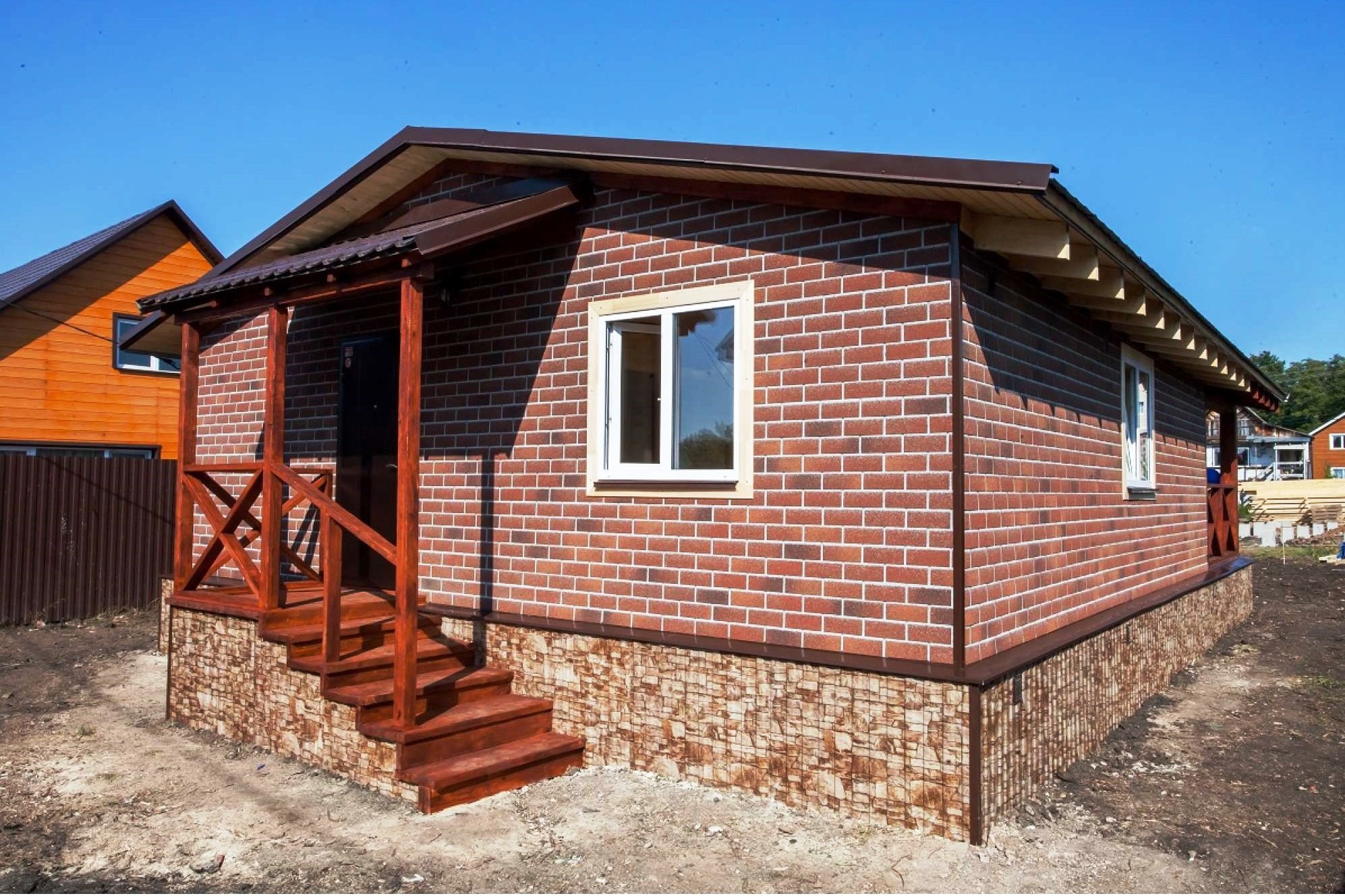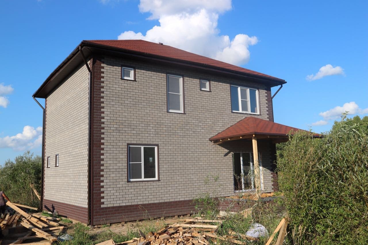 Кирпичный дом с двускатной крышей
