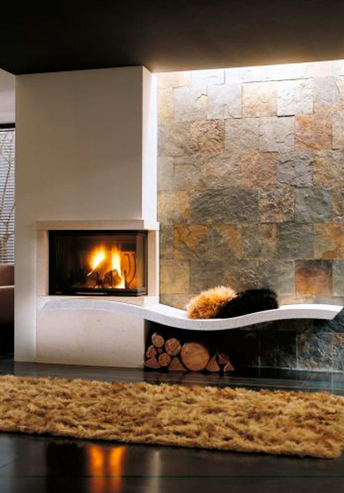 Фото п образного камина в отделке с длинным подиумом на полу