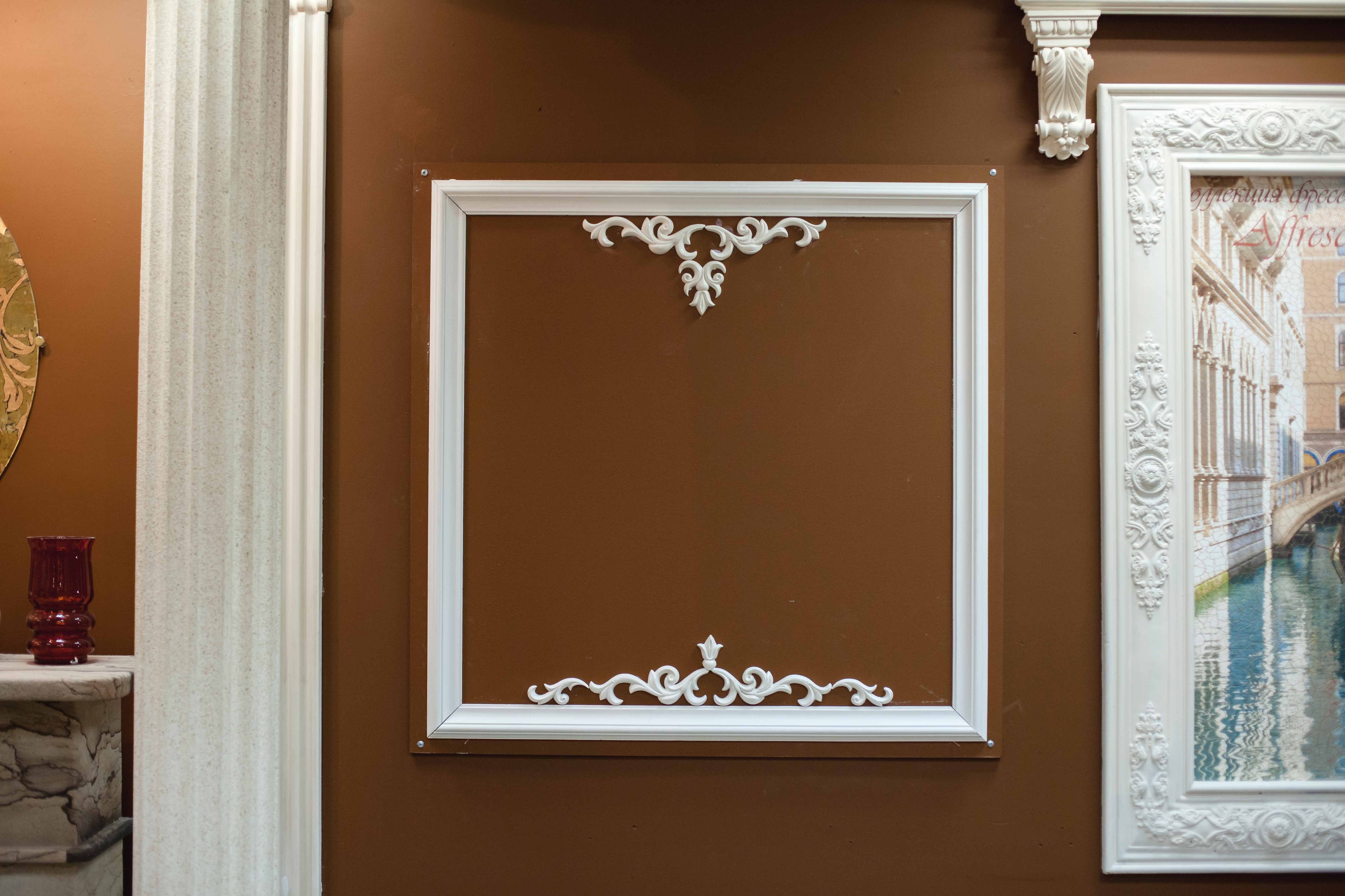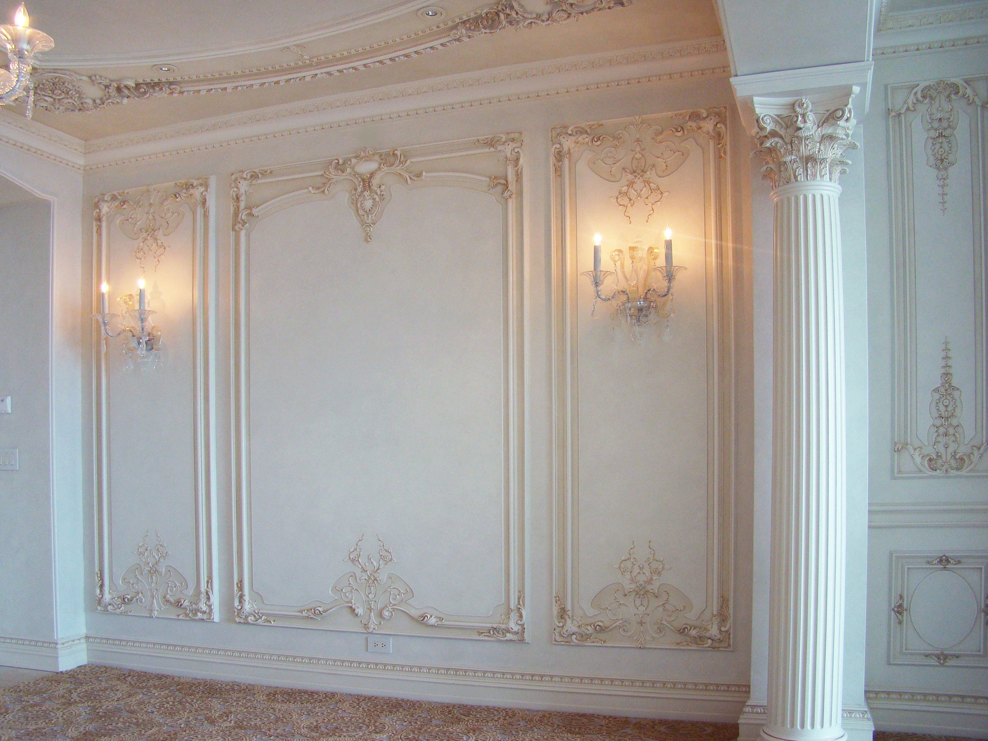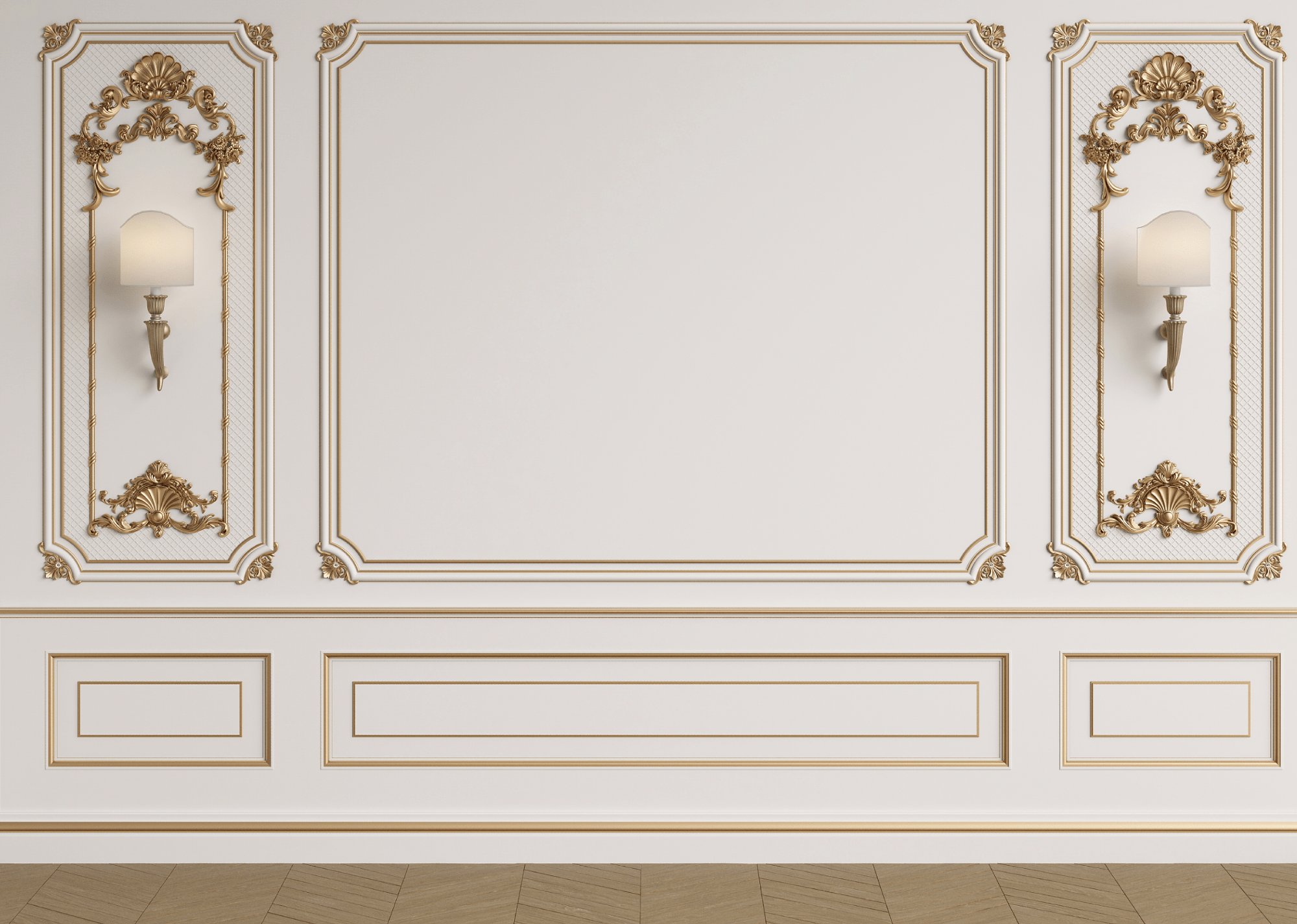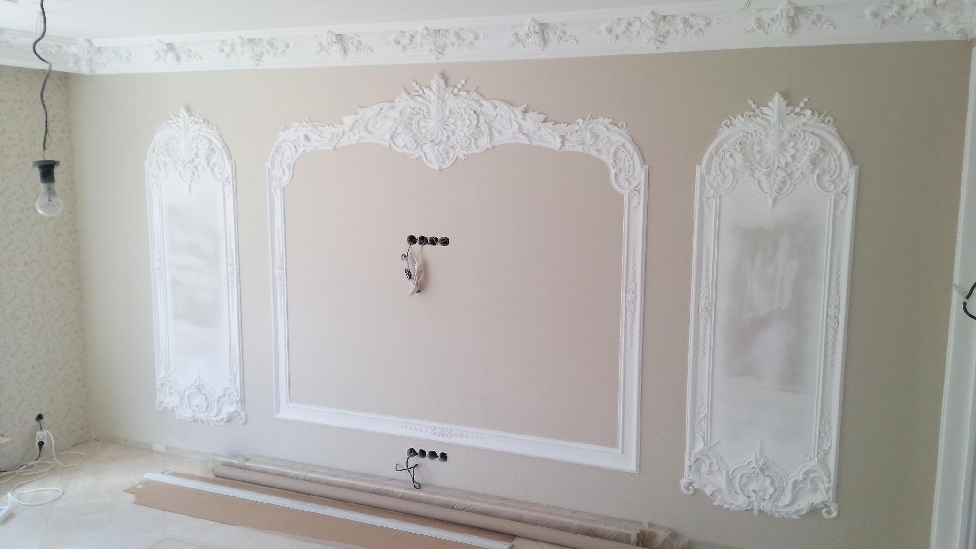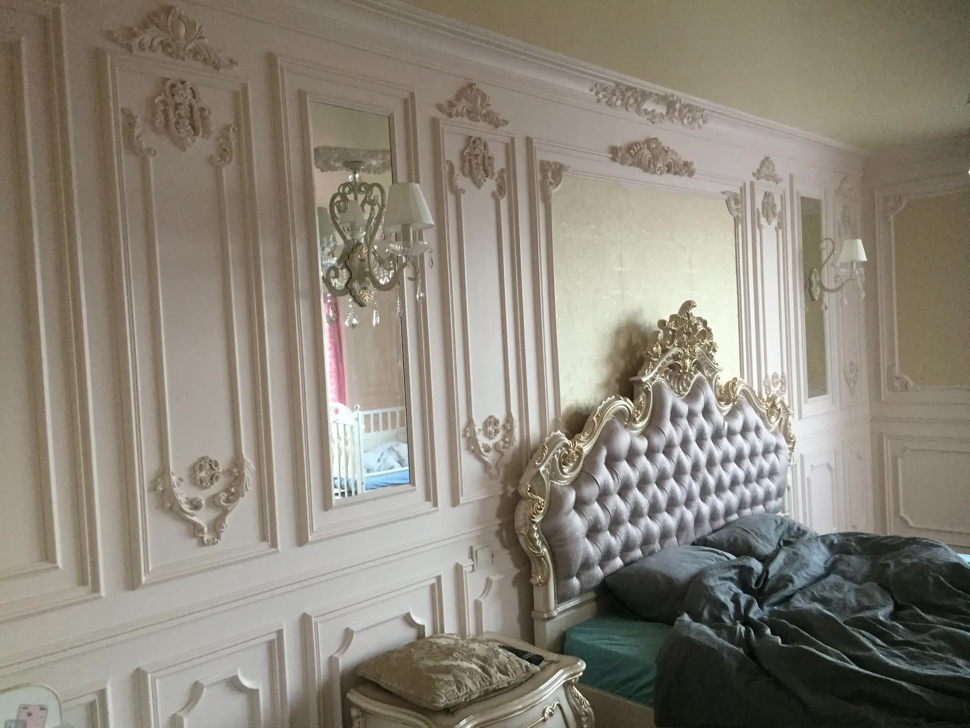 Золотистая лепнина узоры в рамки на стене в интерьере