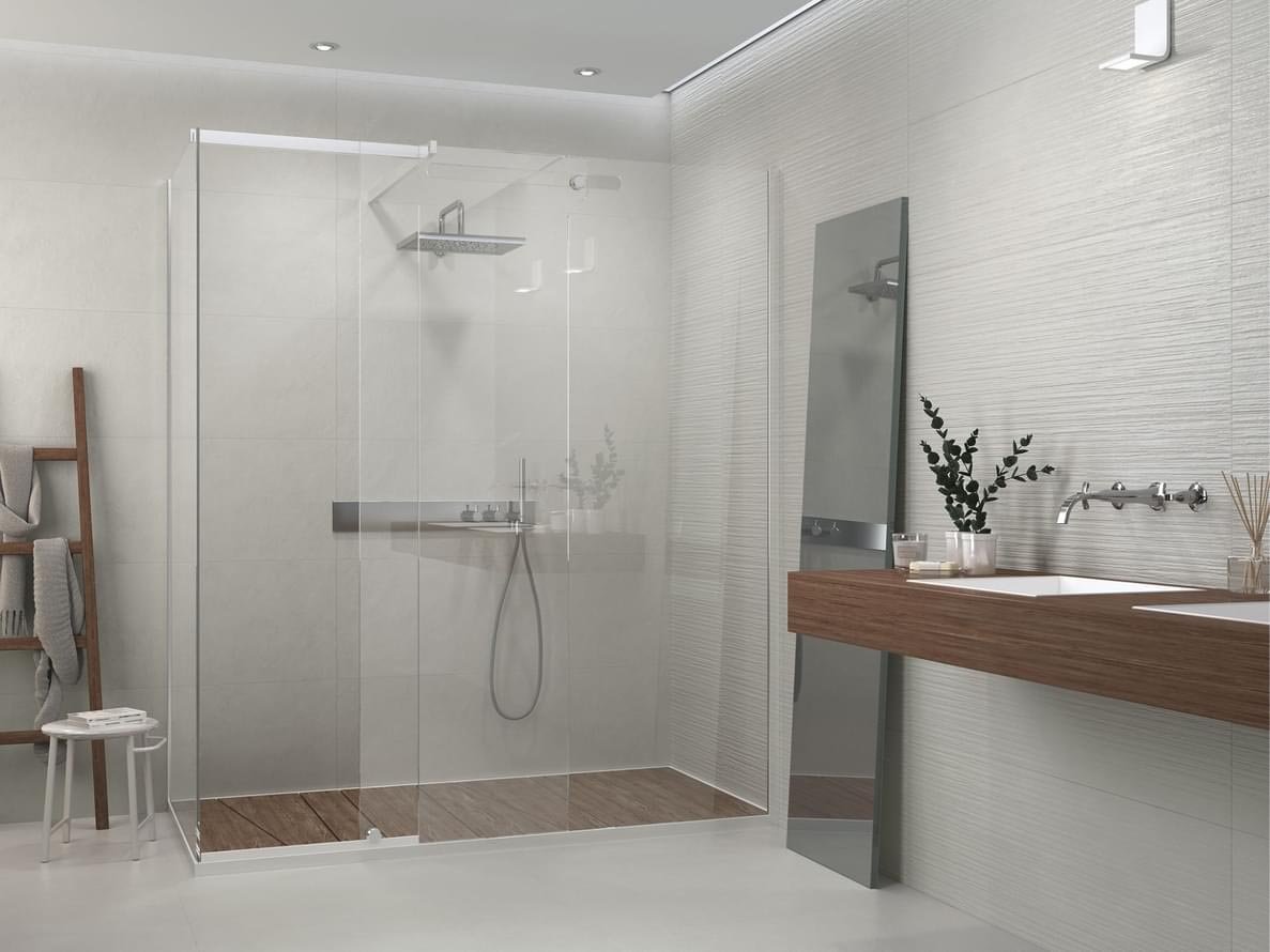 Душевая под дерево и белая плитка