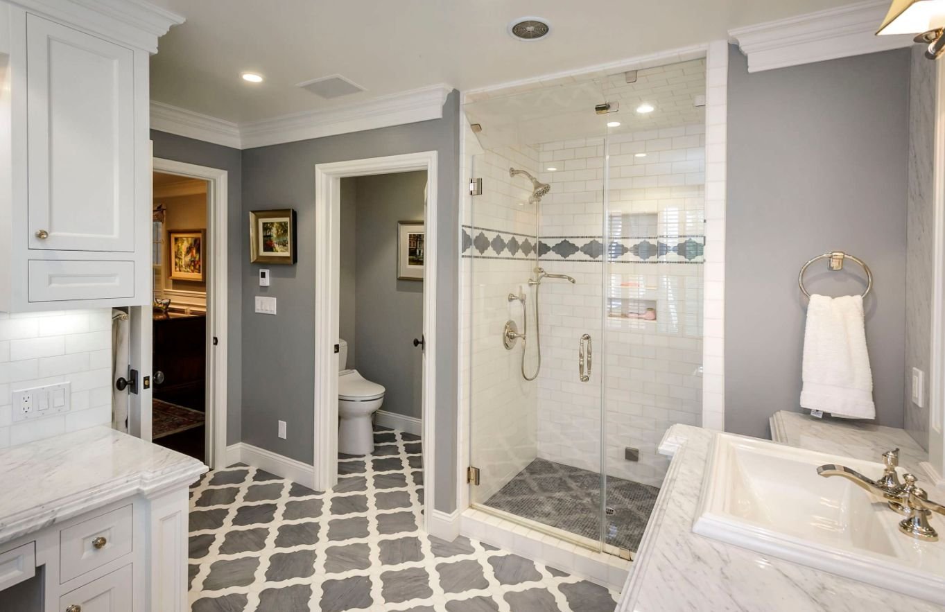 Большая ванная комната с душем и туалетом
