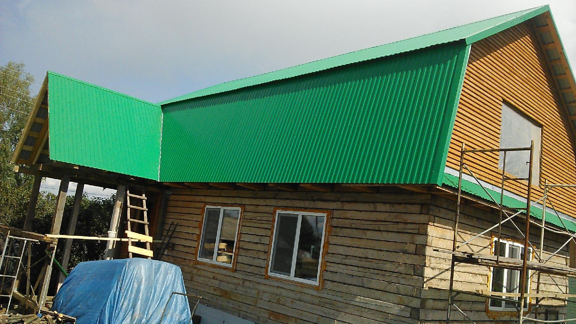 Двухскатная крыша из зеленого профнастил