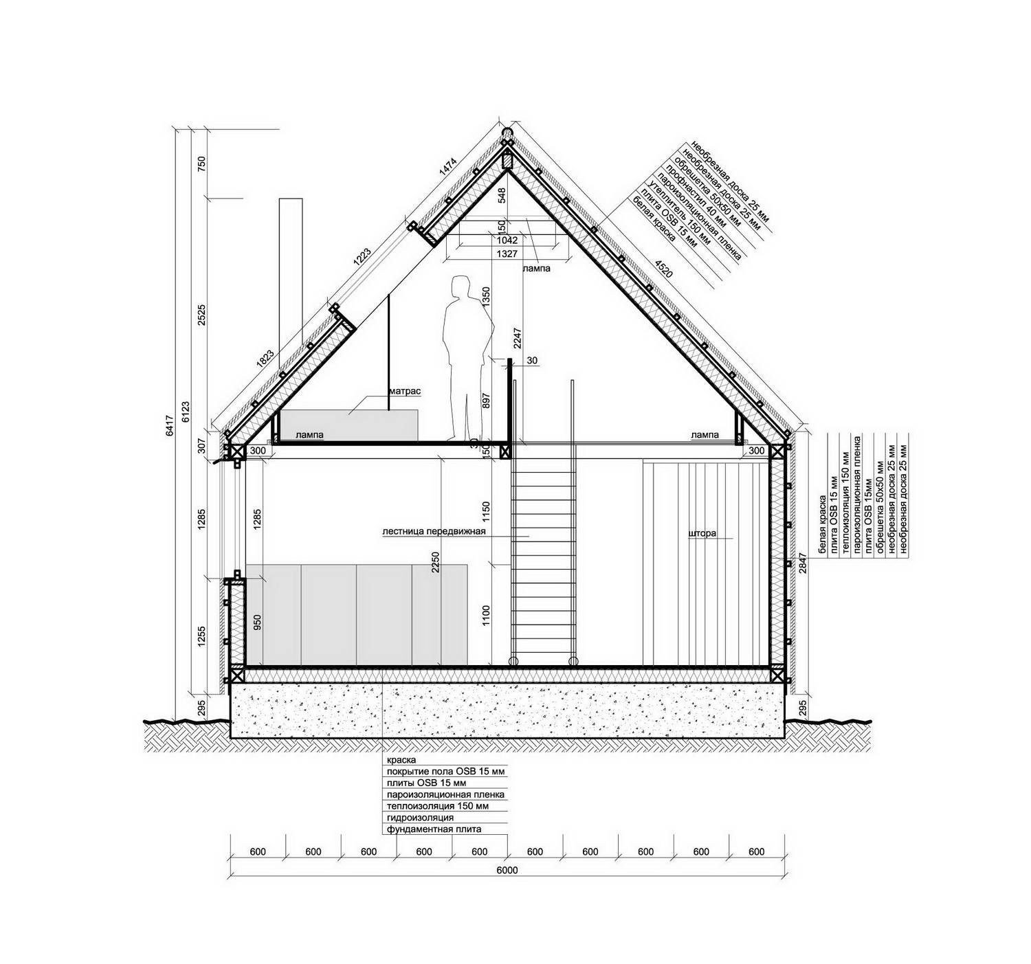 Мансардный этаж с двухскатной крышей чертеж