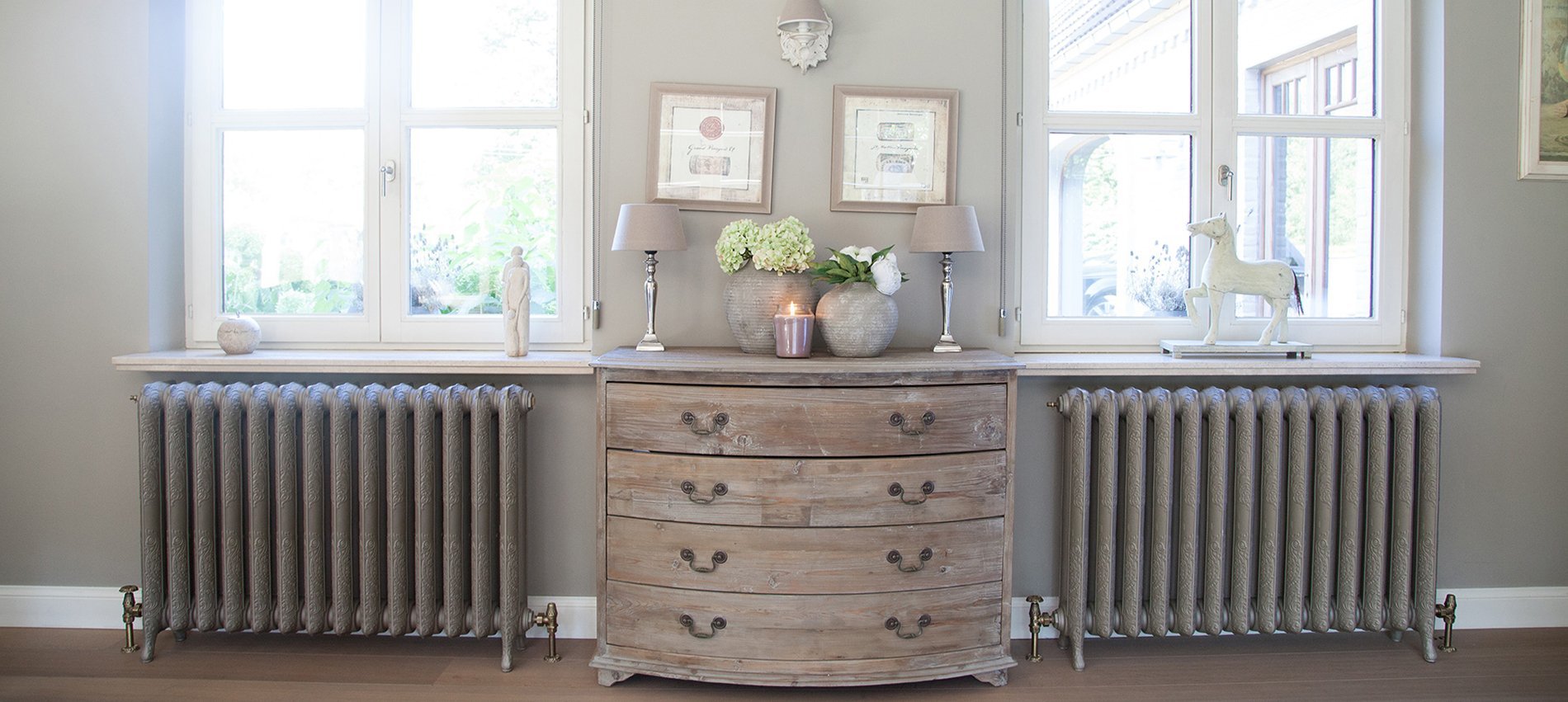 Серые чугунные батареи в интерьере