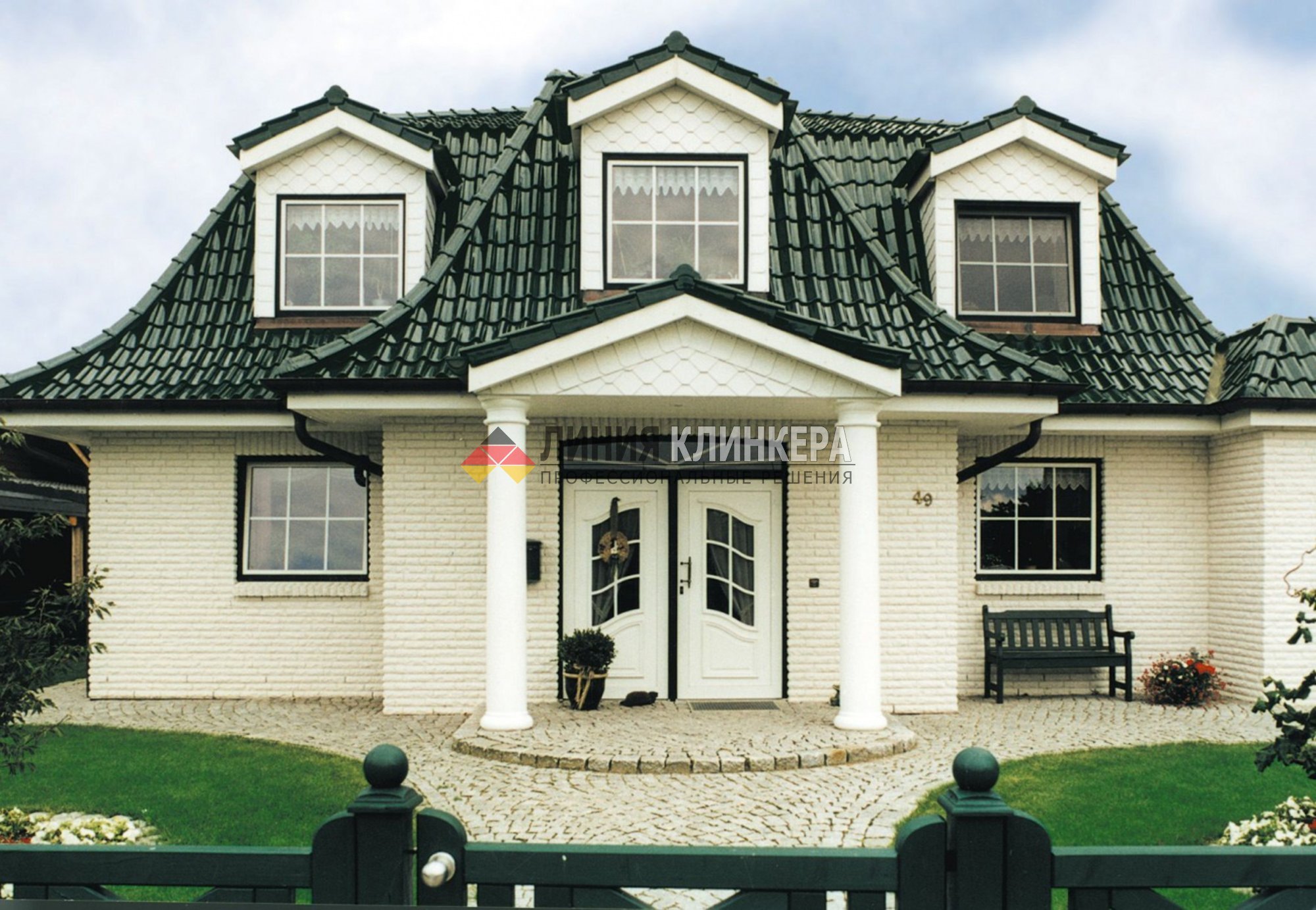 Кирпичный дом с зеленой крышей