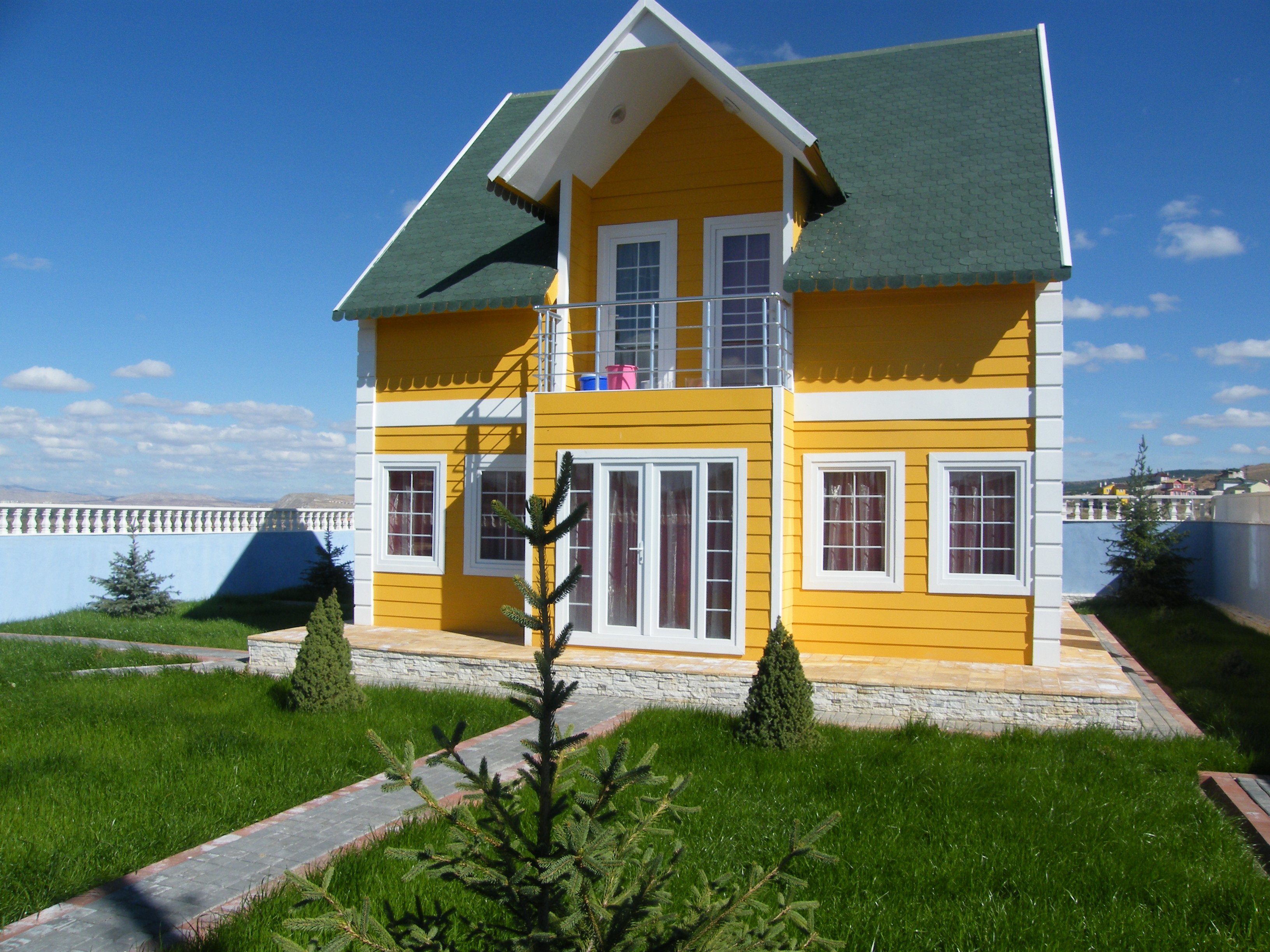 Желтые домики с зеленой крышей