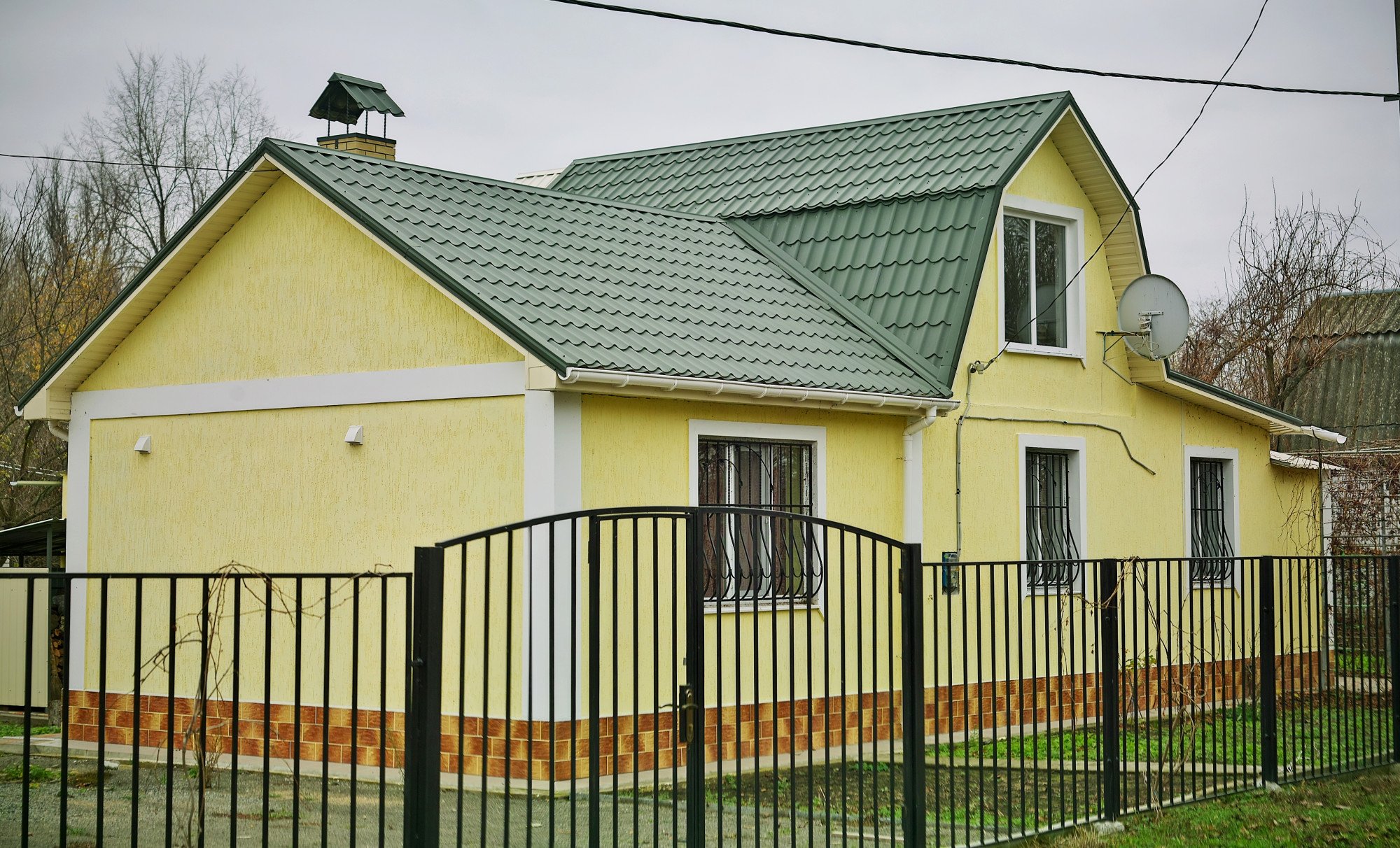 Желтый дом с зеленой крышей