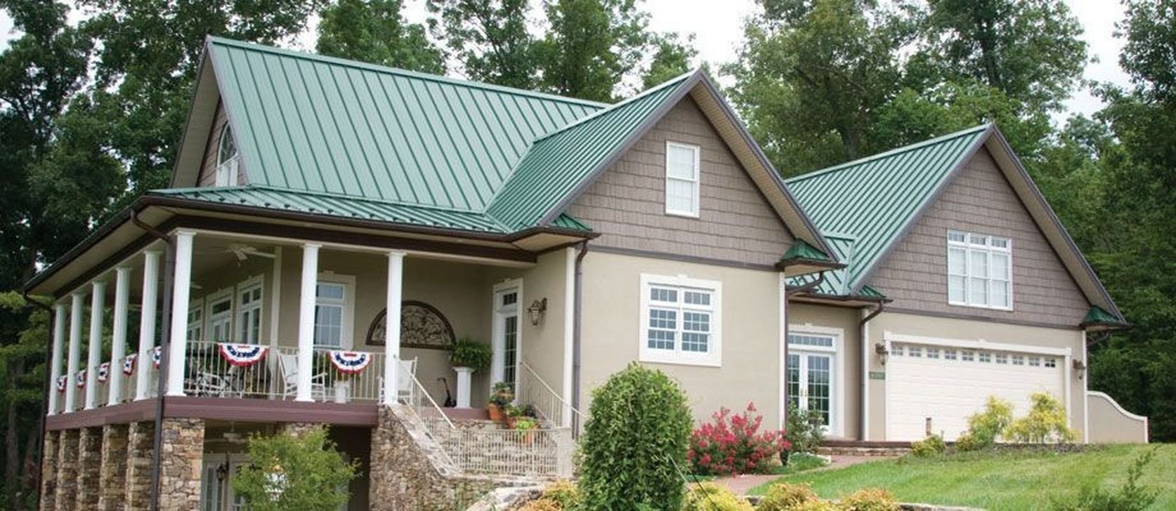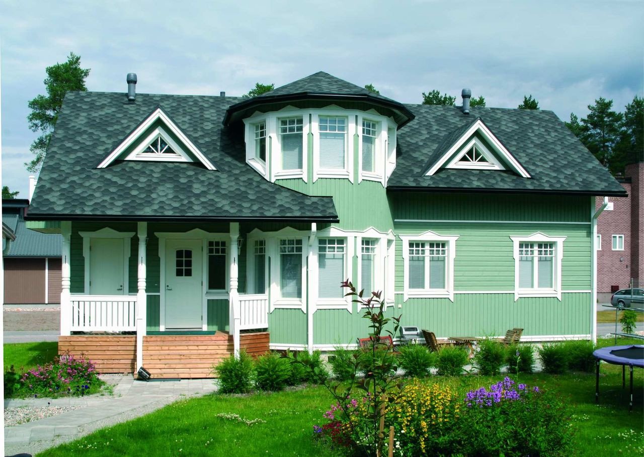 Облицовка дома с зеленой крышей