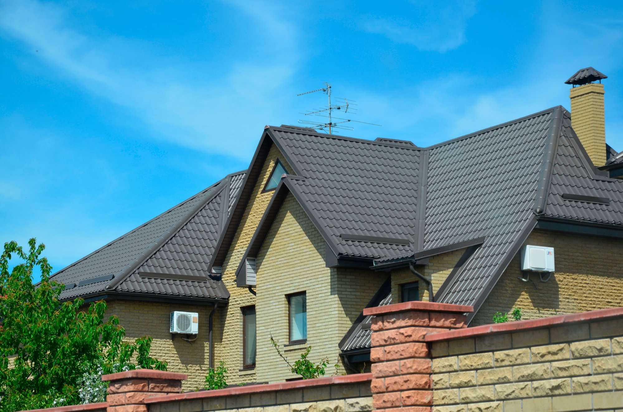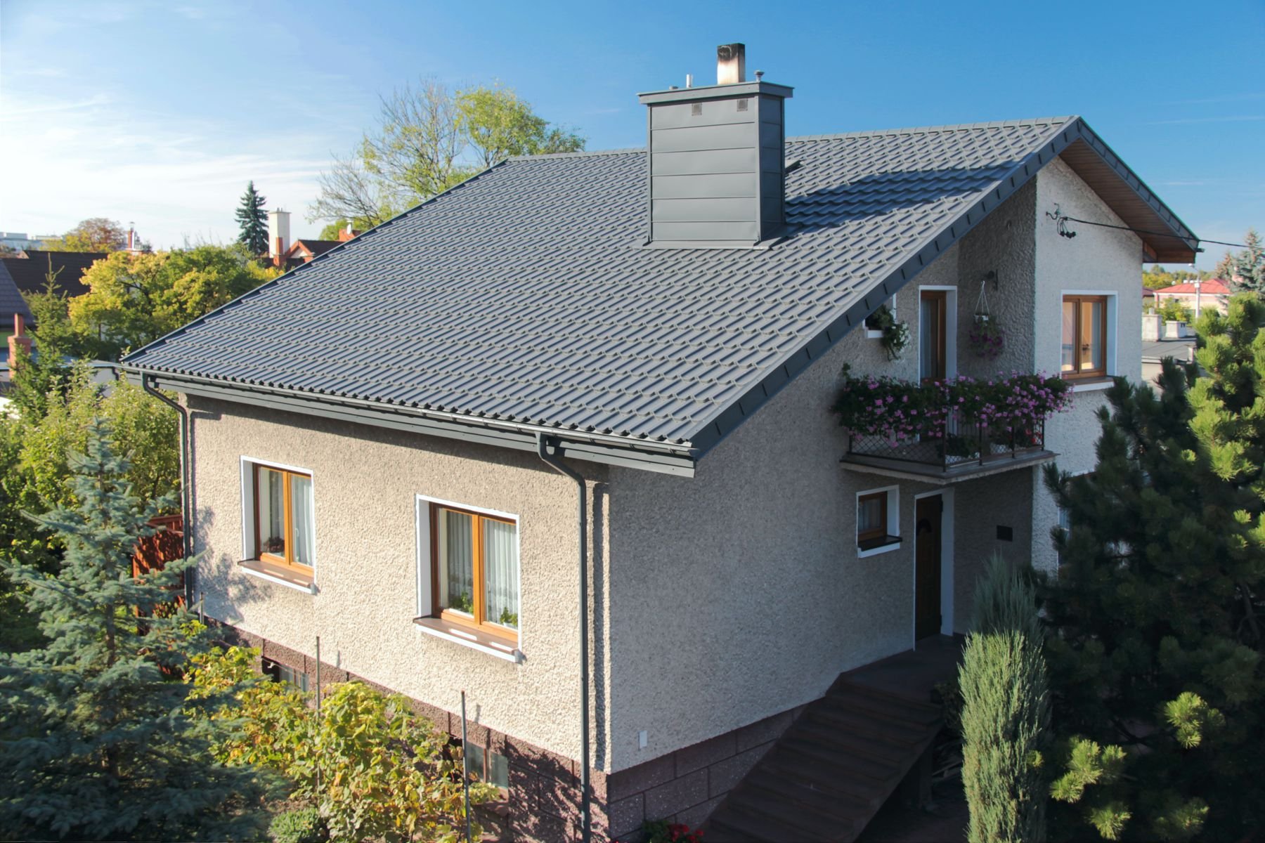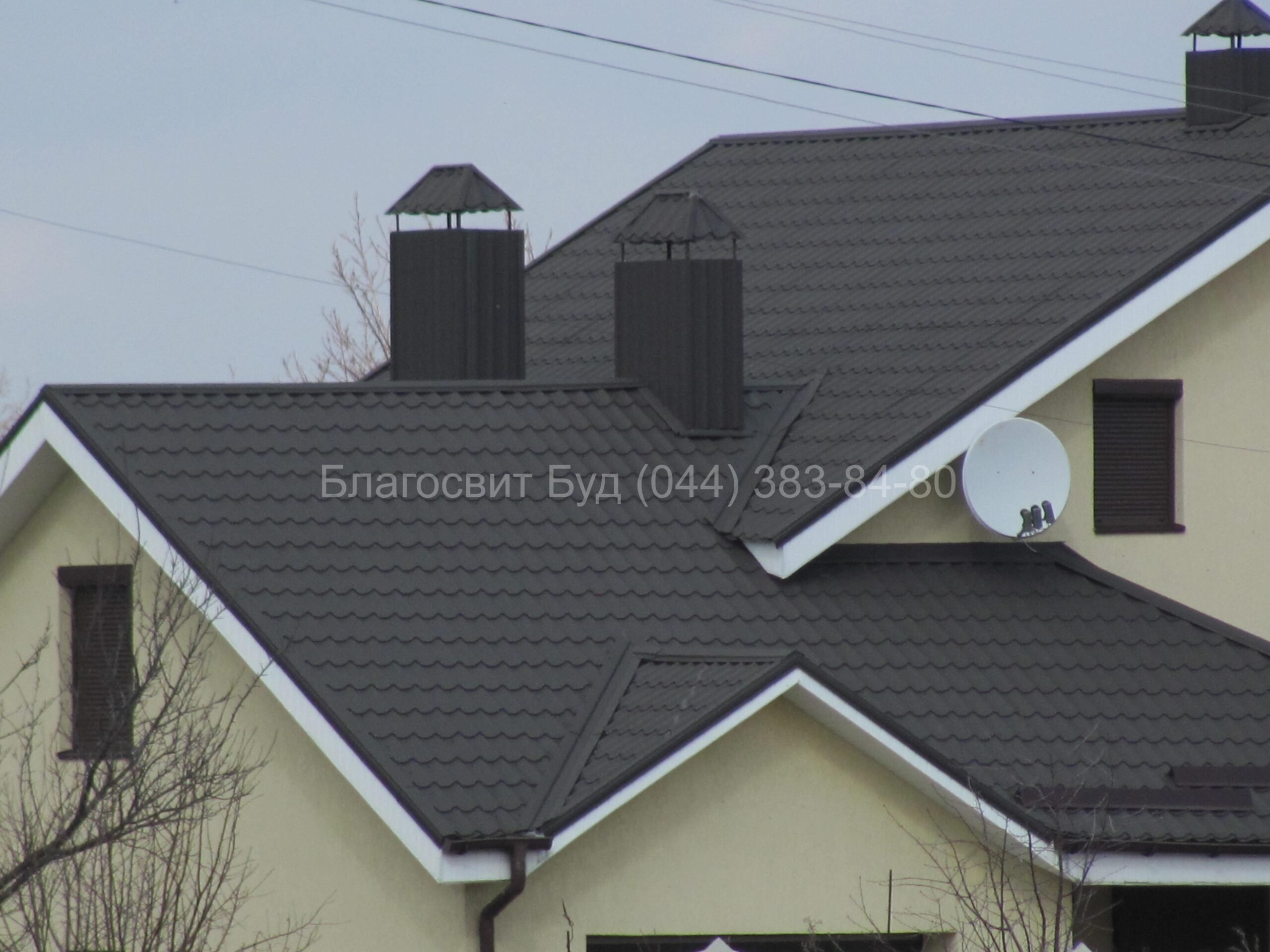 Фасад дом с серой металлочерепицей