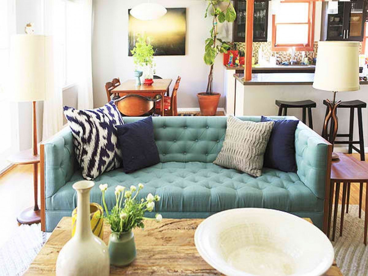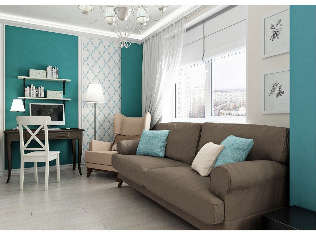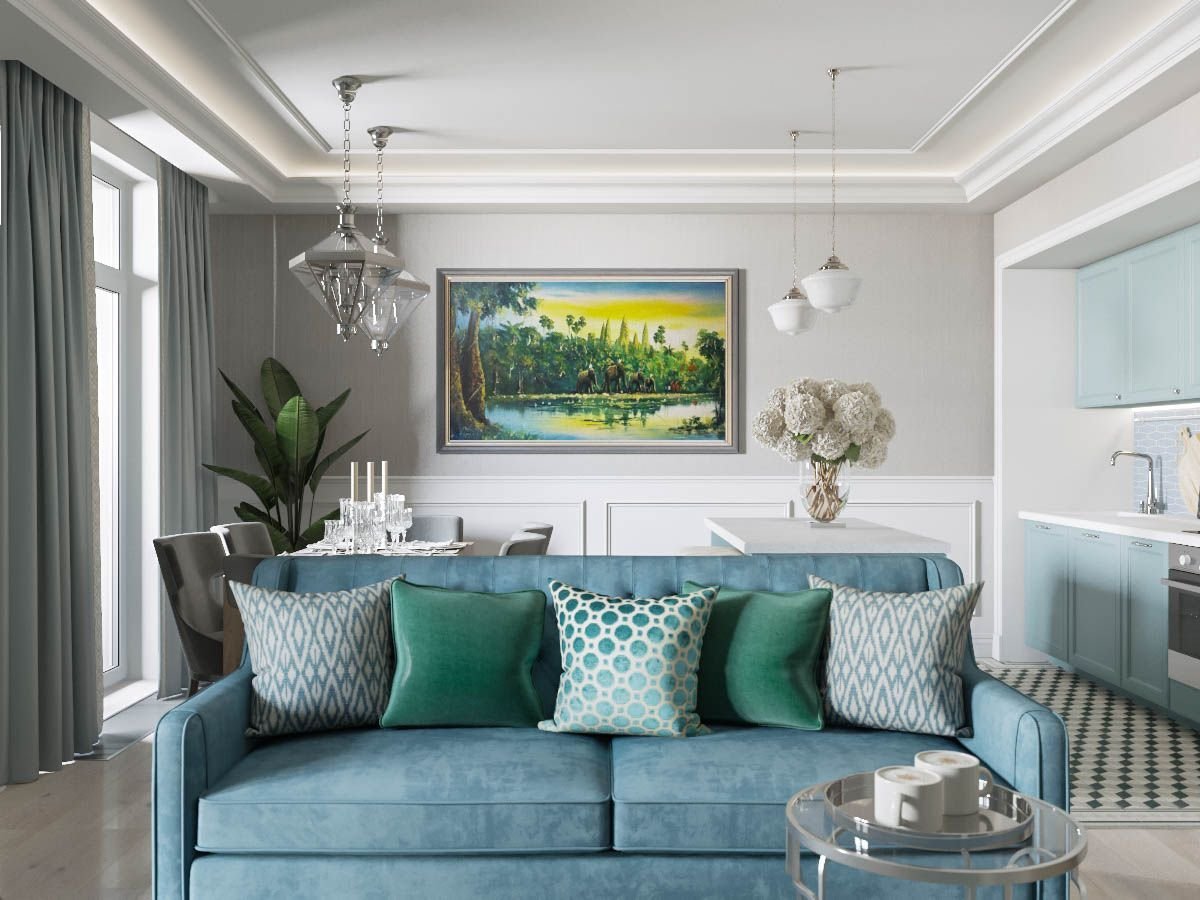 Гостиная в бирюзовых тонах в современном стиле с кухней