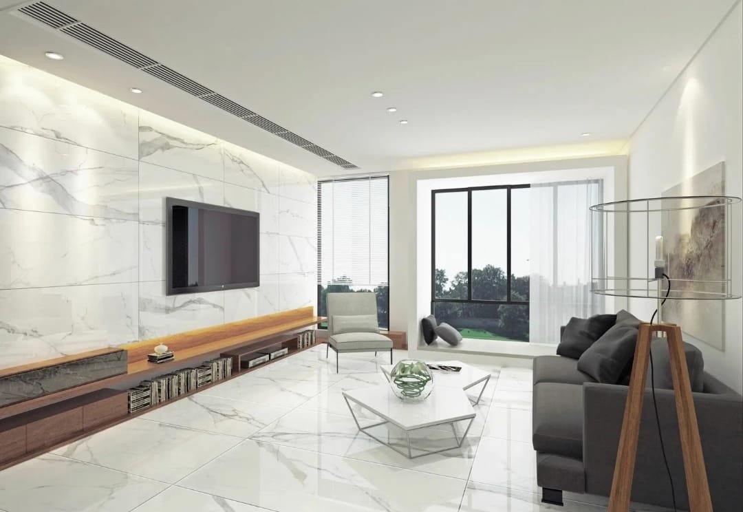 Керамогранит в зоне ТВ В гостиной