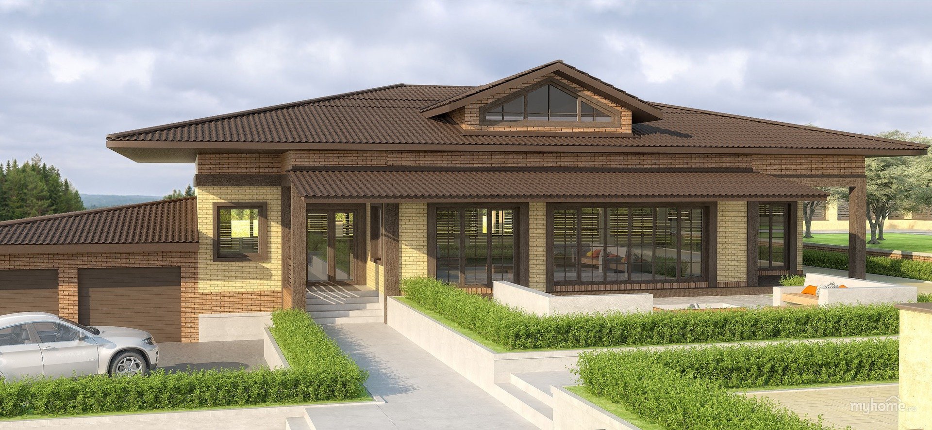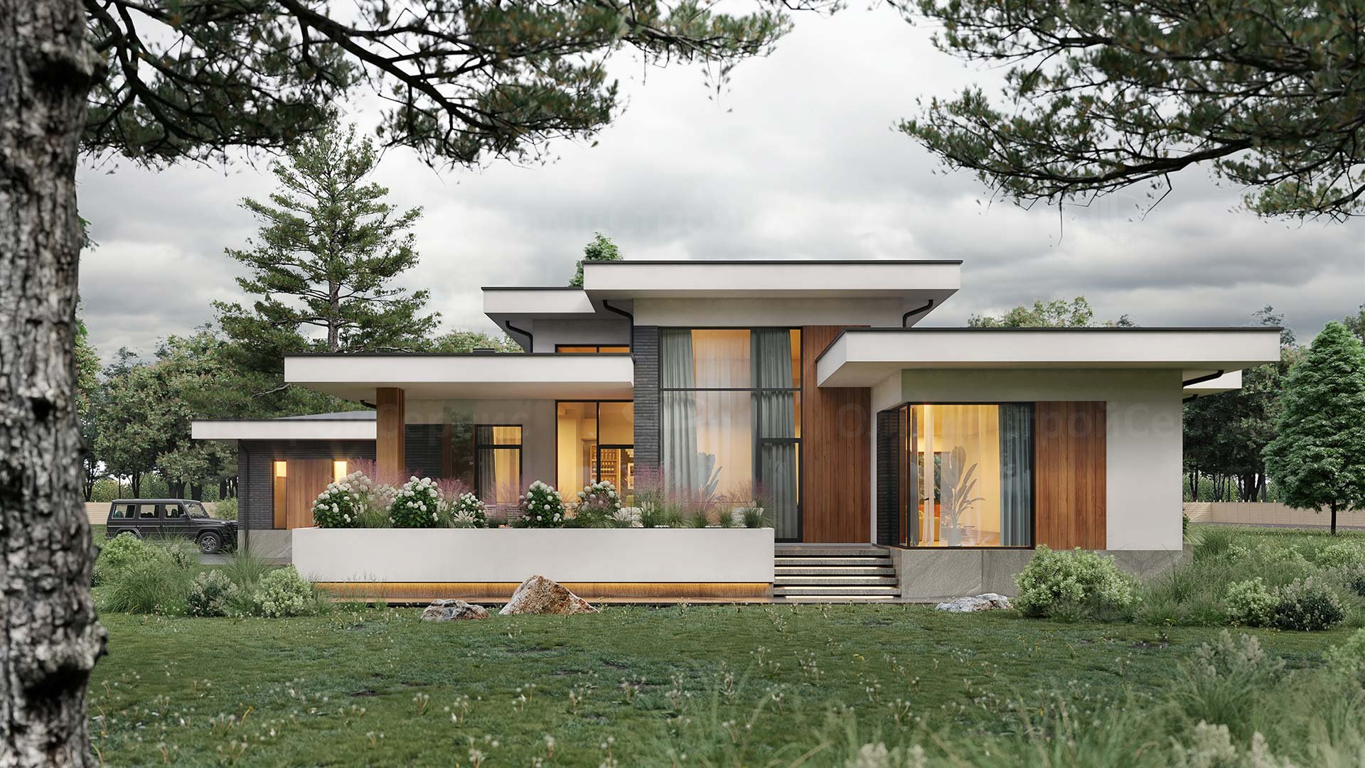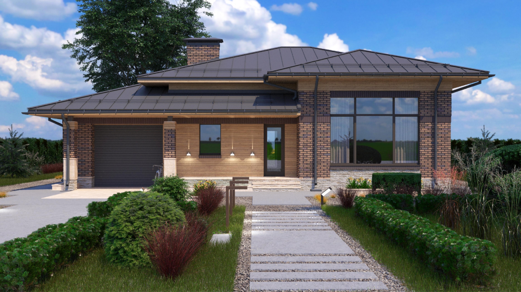 Одноэтажный дом с гаражом в стиле Райта