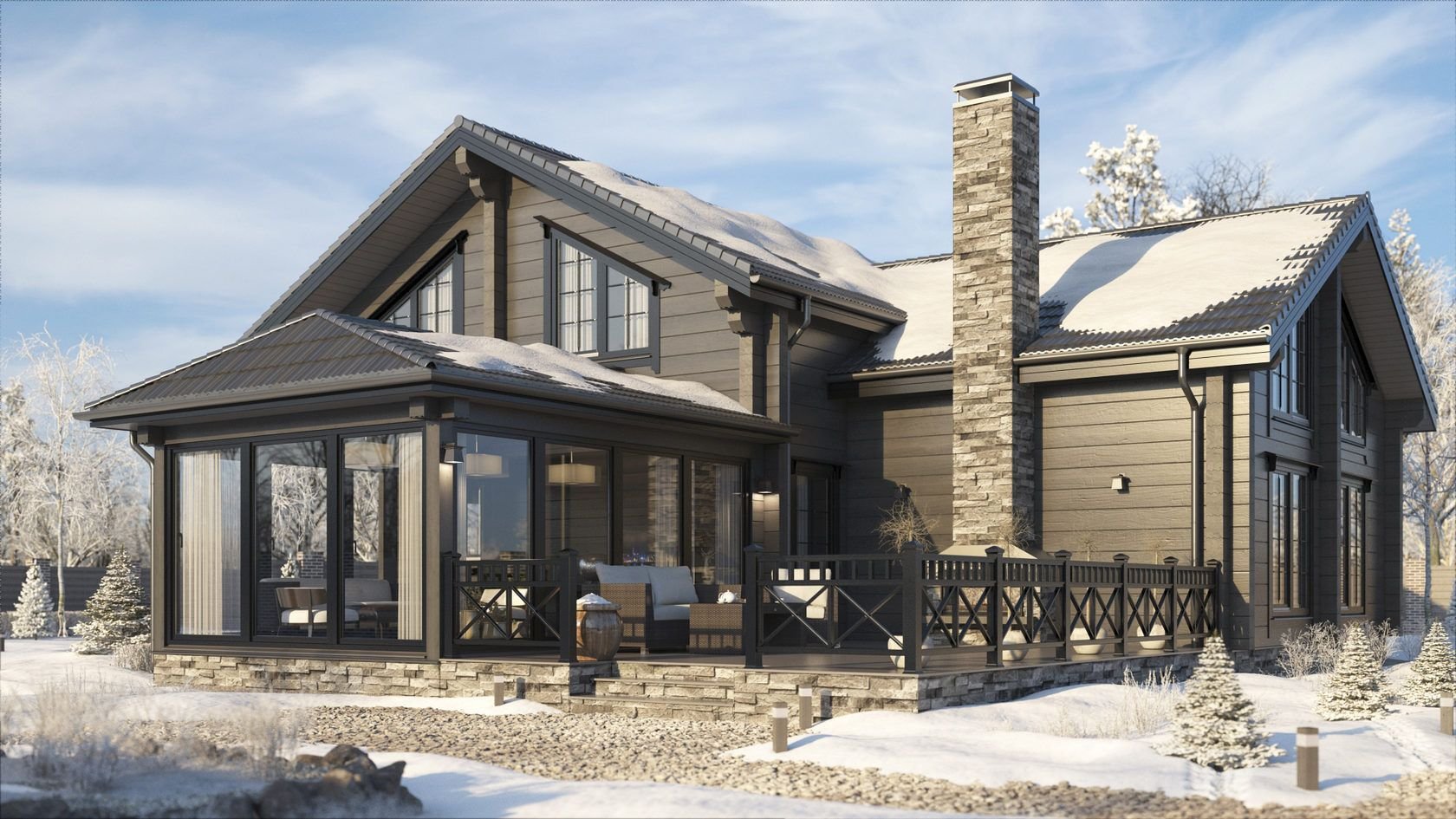 Деревянный дом с графитовыми окнами
