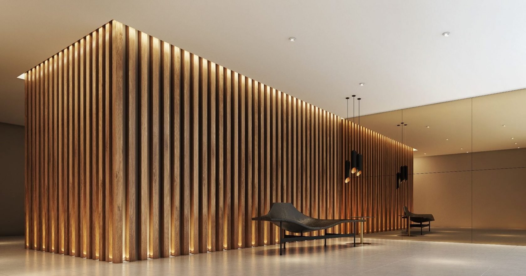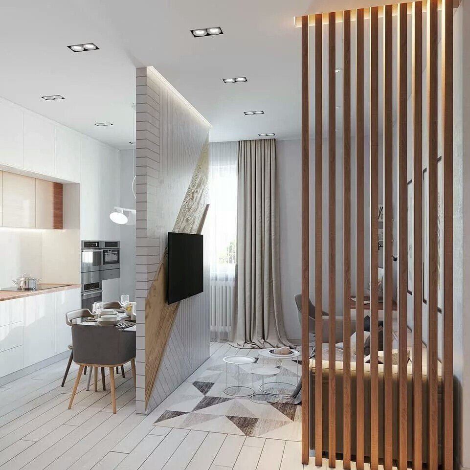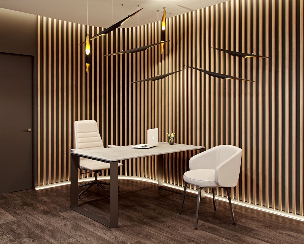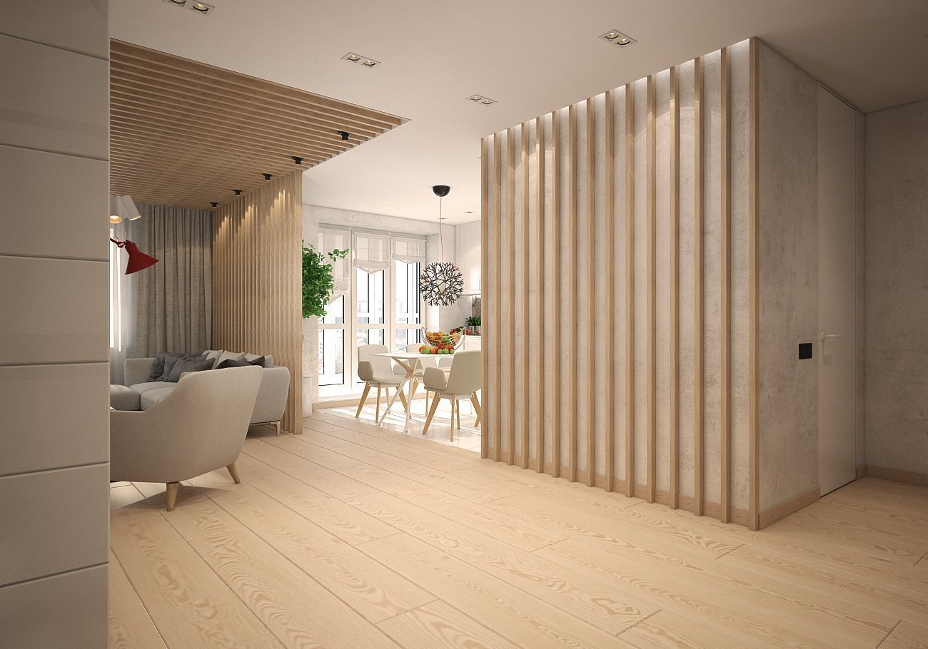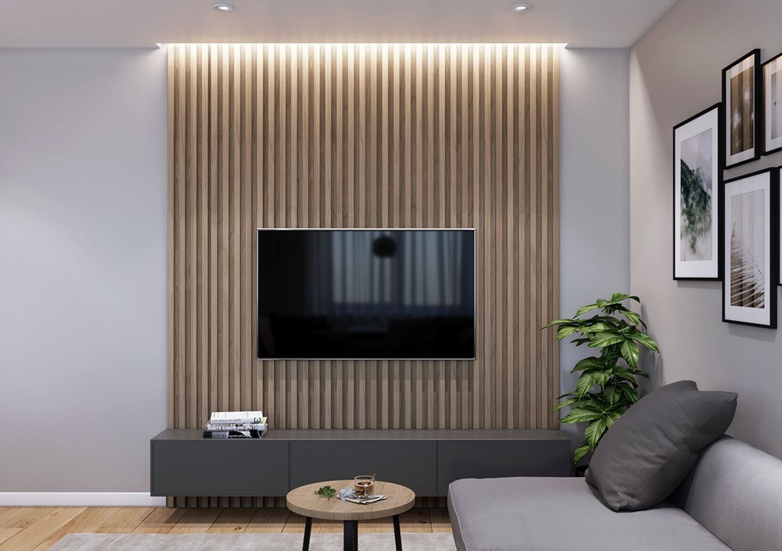 Гостиная с деревянными рейками