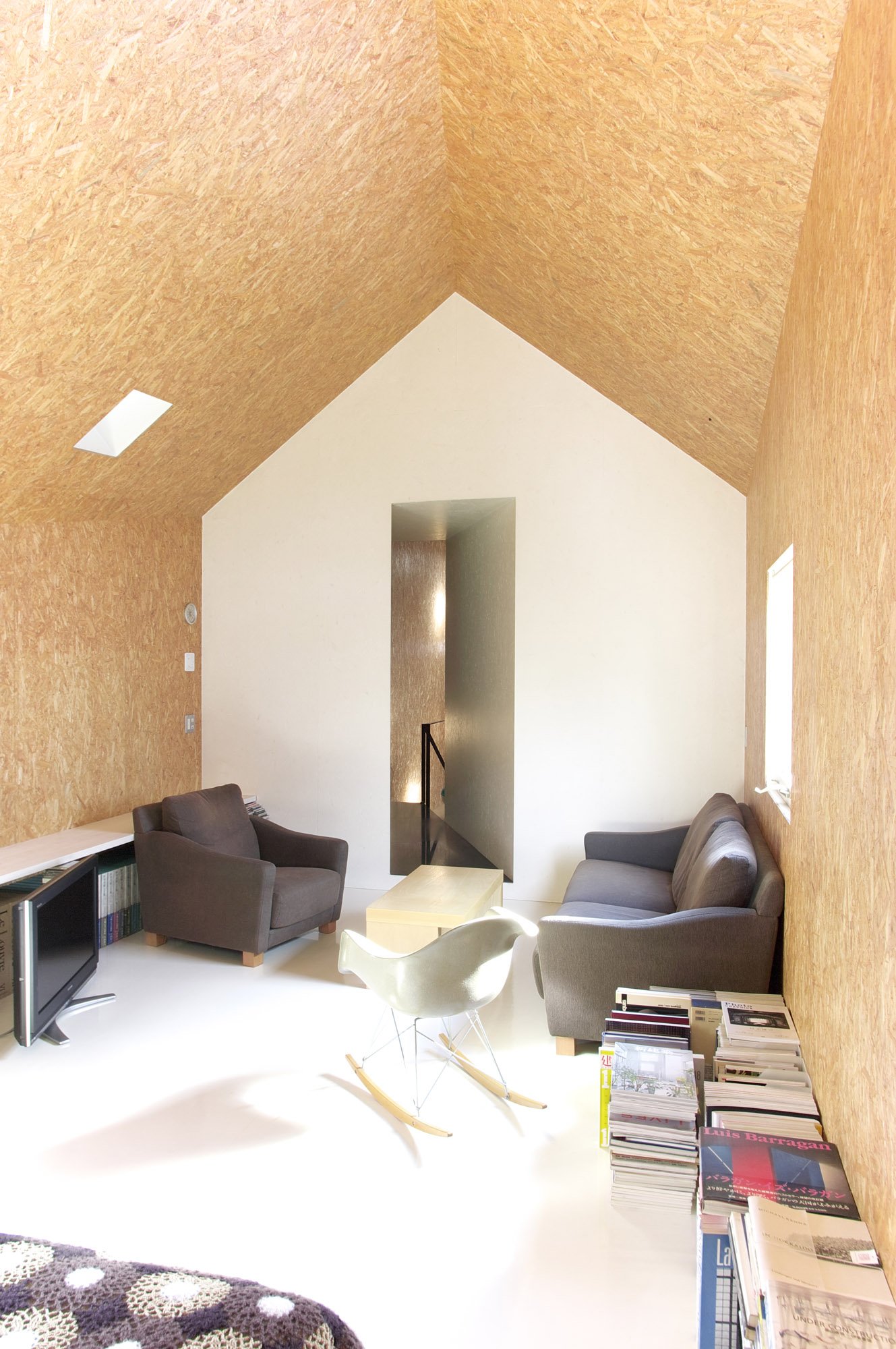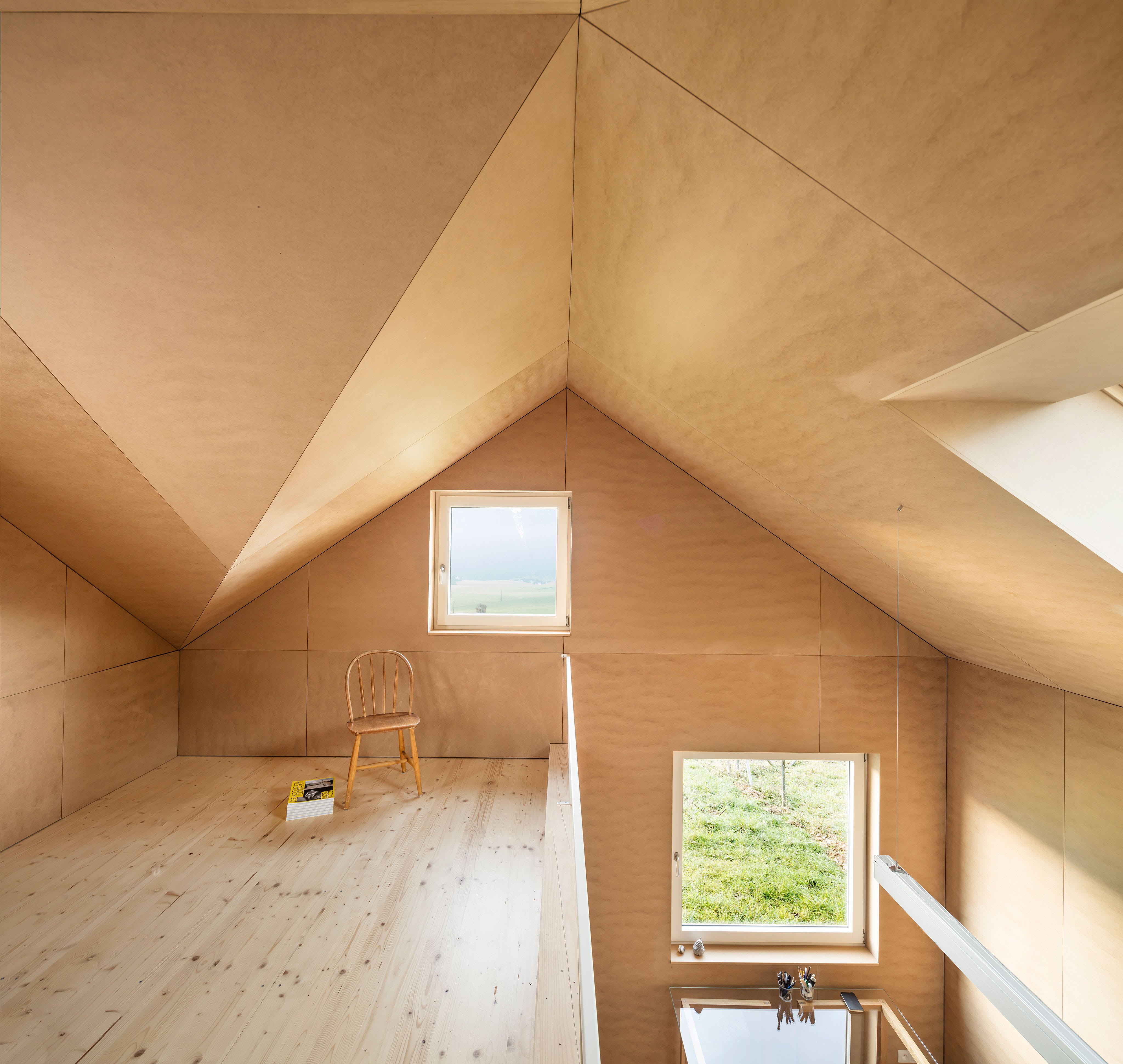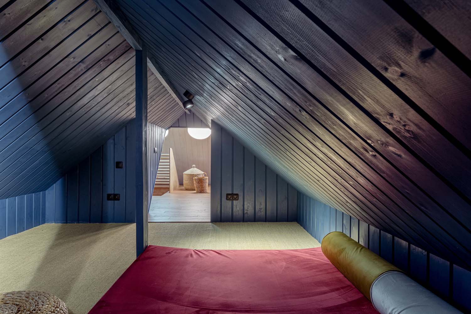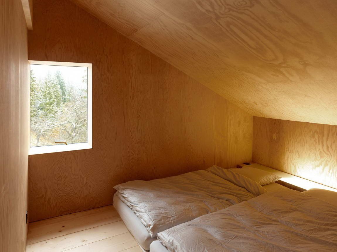 Второй этаж мансардного типа обшит фанерой