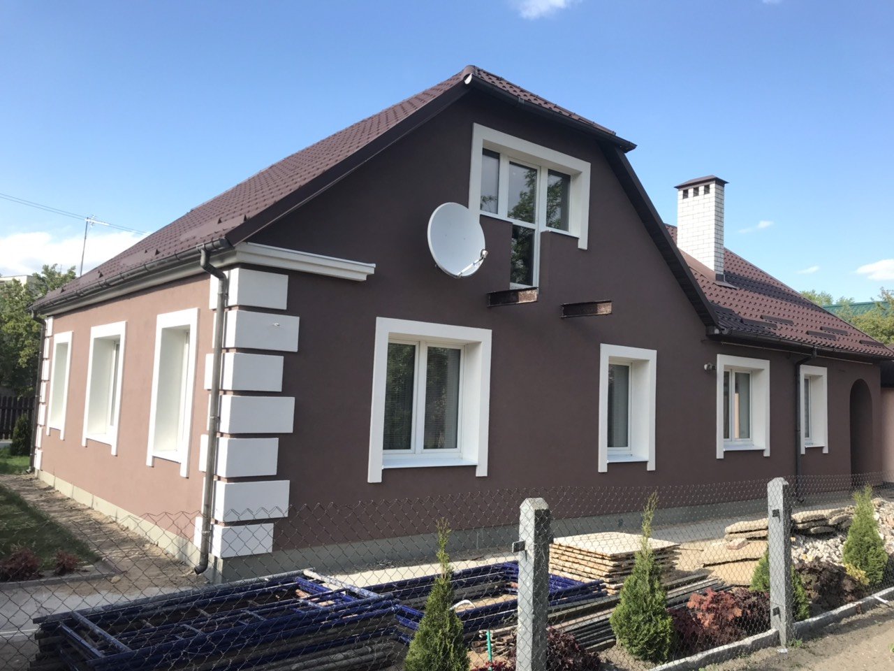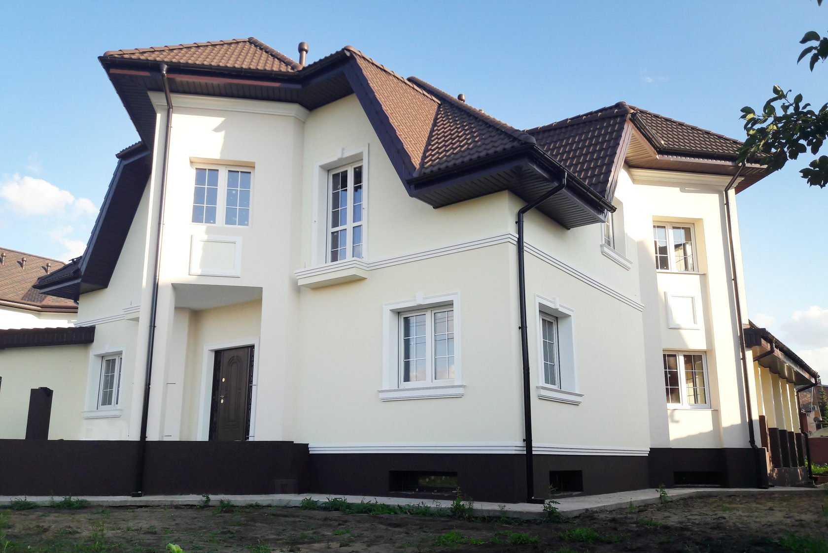 Оштукатуренный дом с коричневой крышей