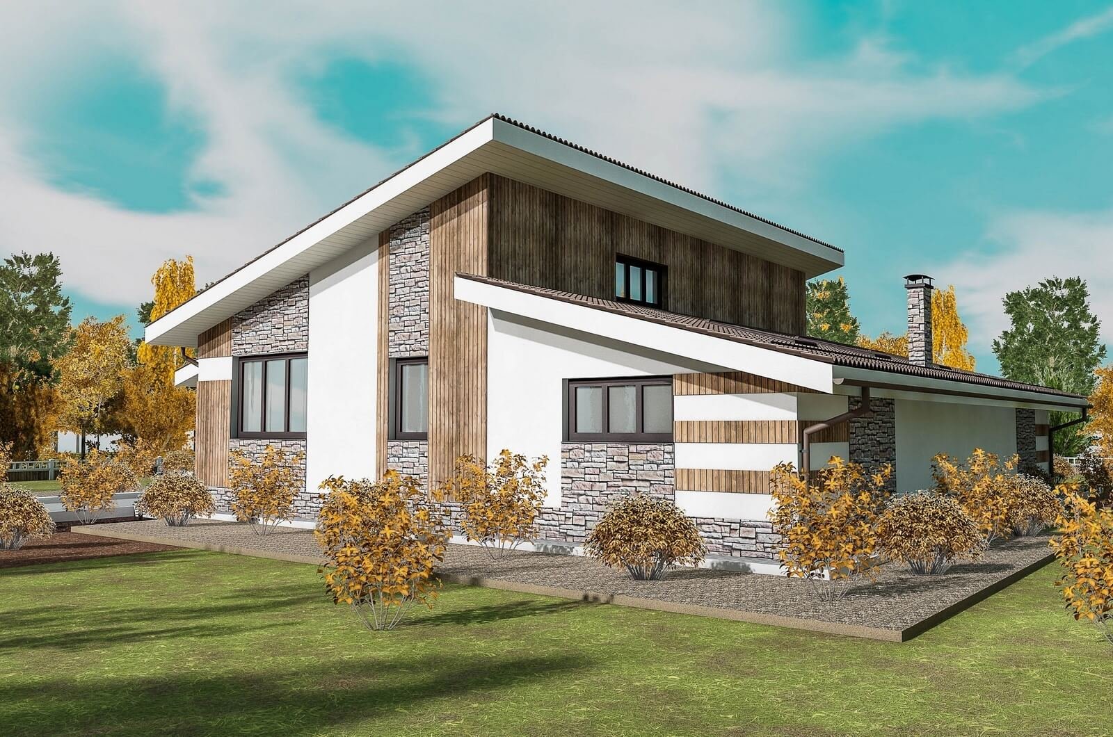 Двухэтажный дом с разноуровневой крышей
