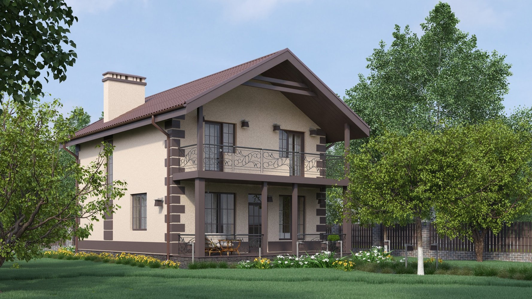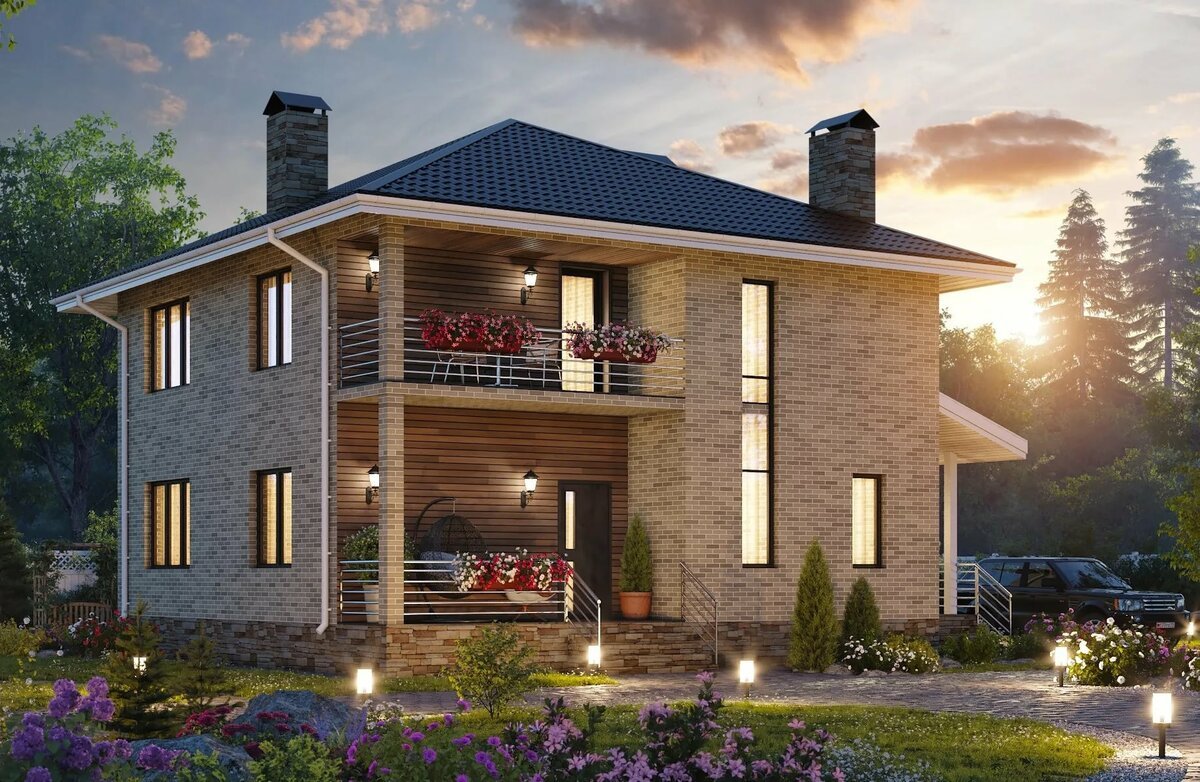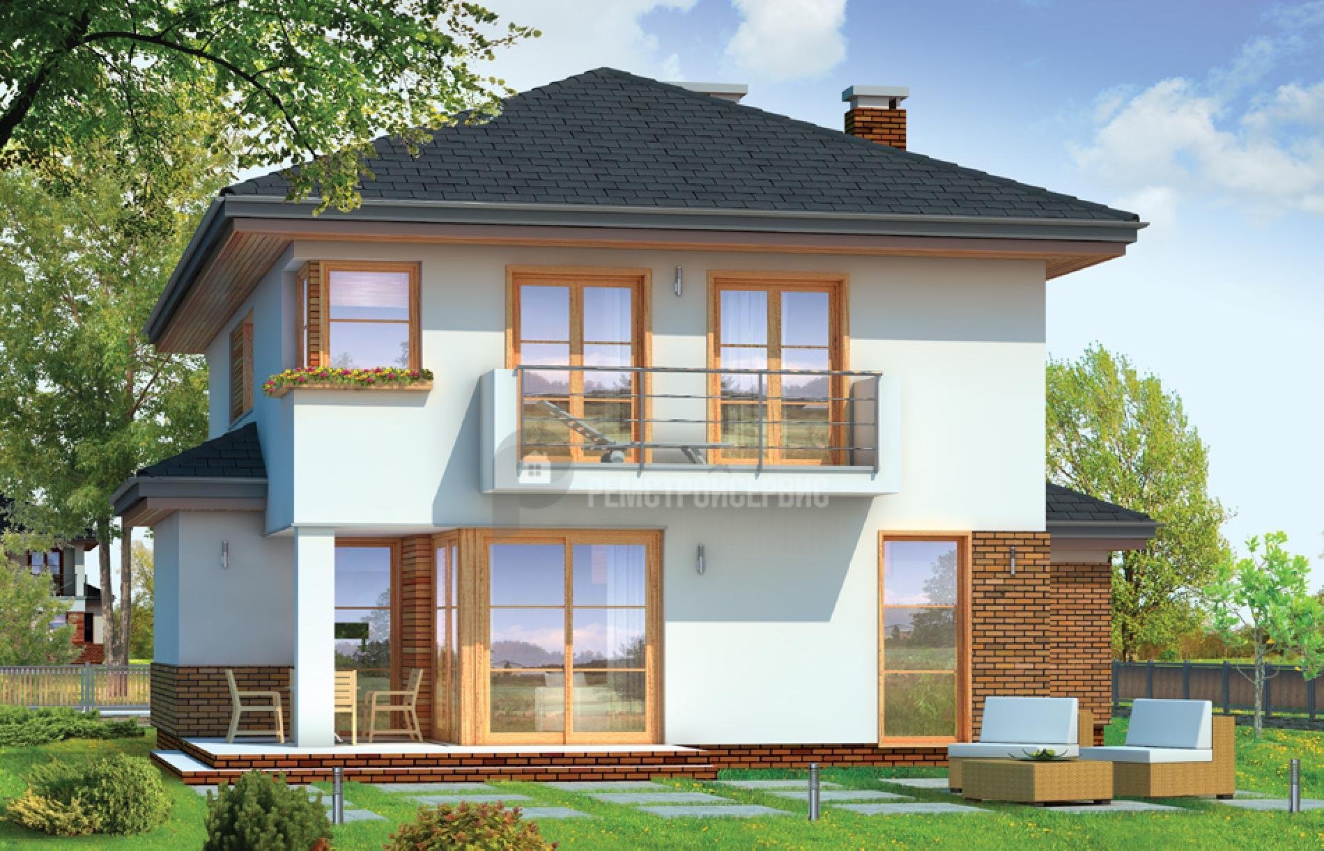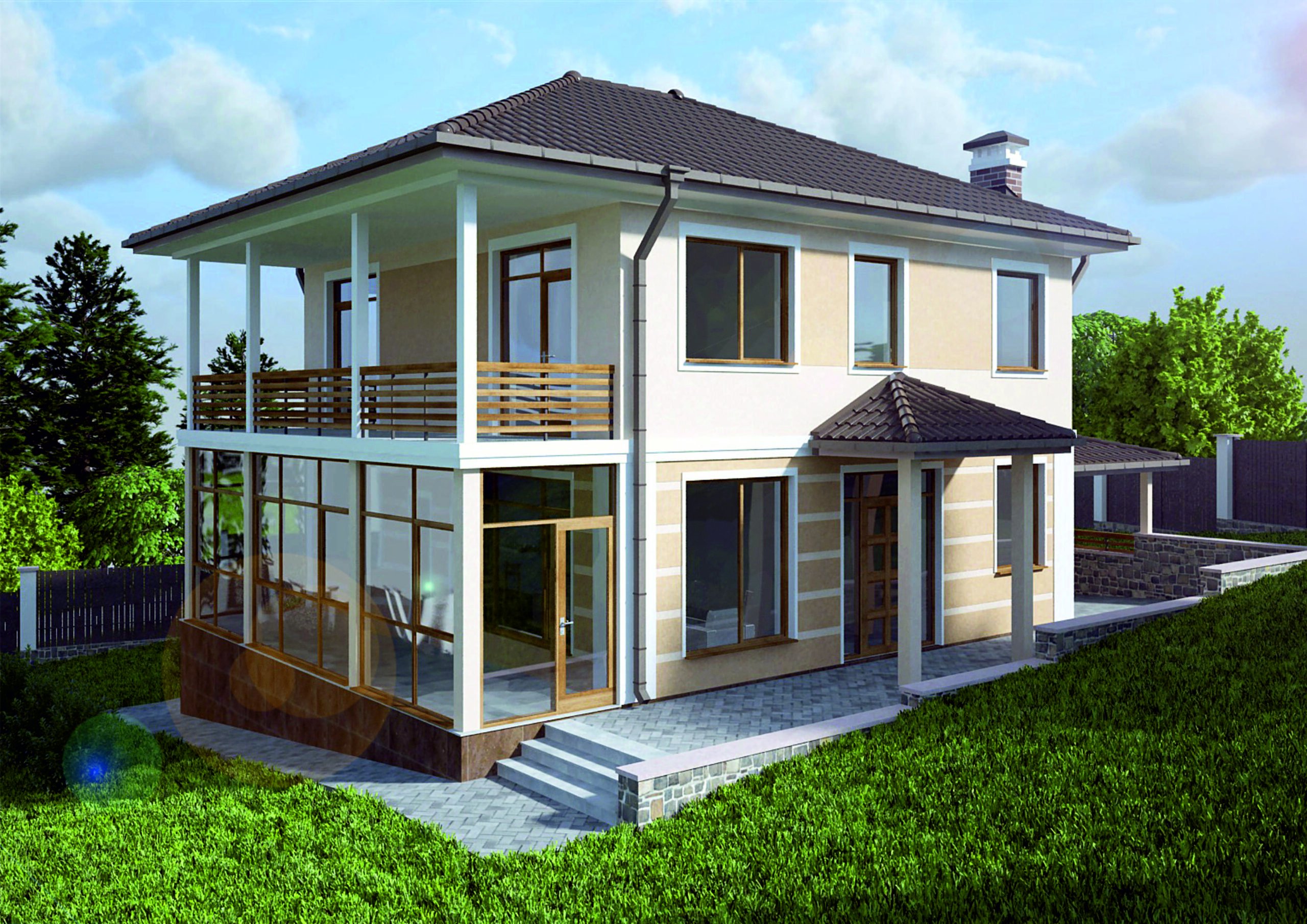 Двухэтажный дом с террасой и балконом