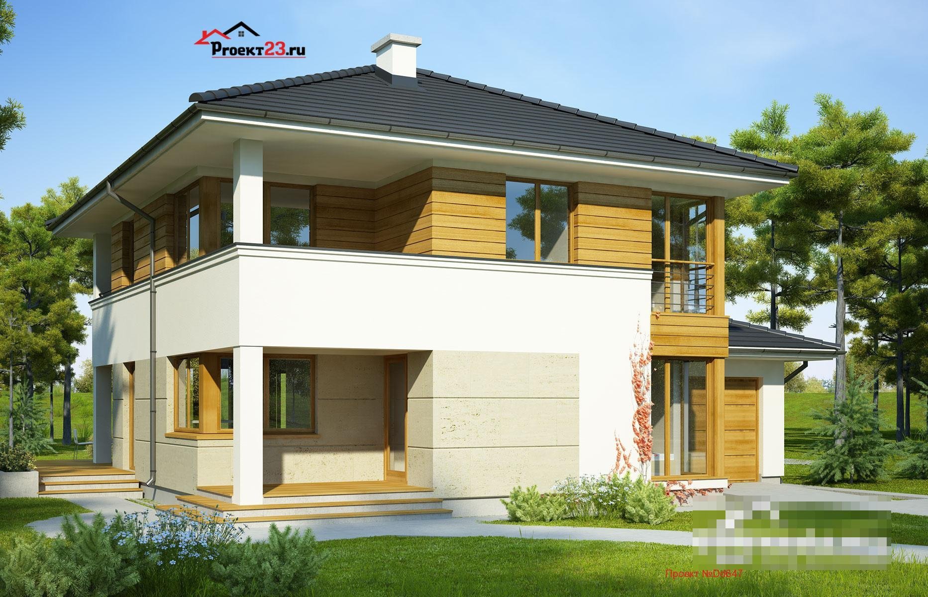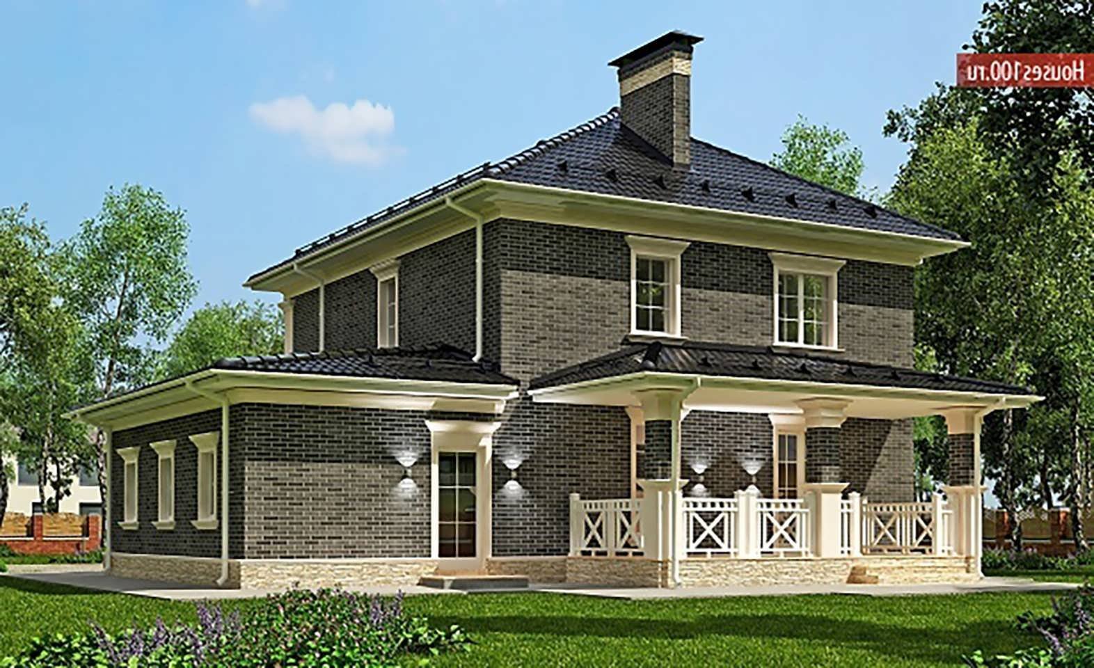 Двухэтажный дом с четырехскатной крышей и террасой