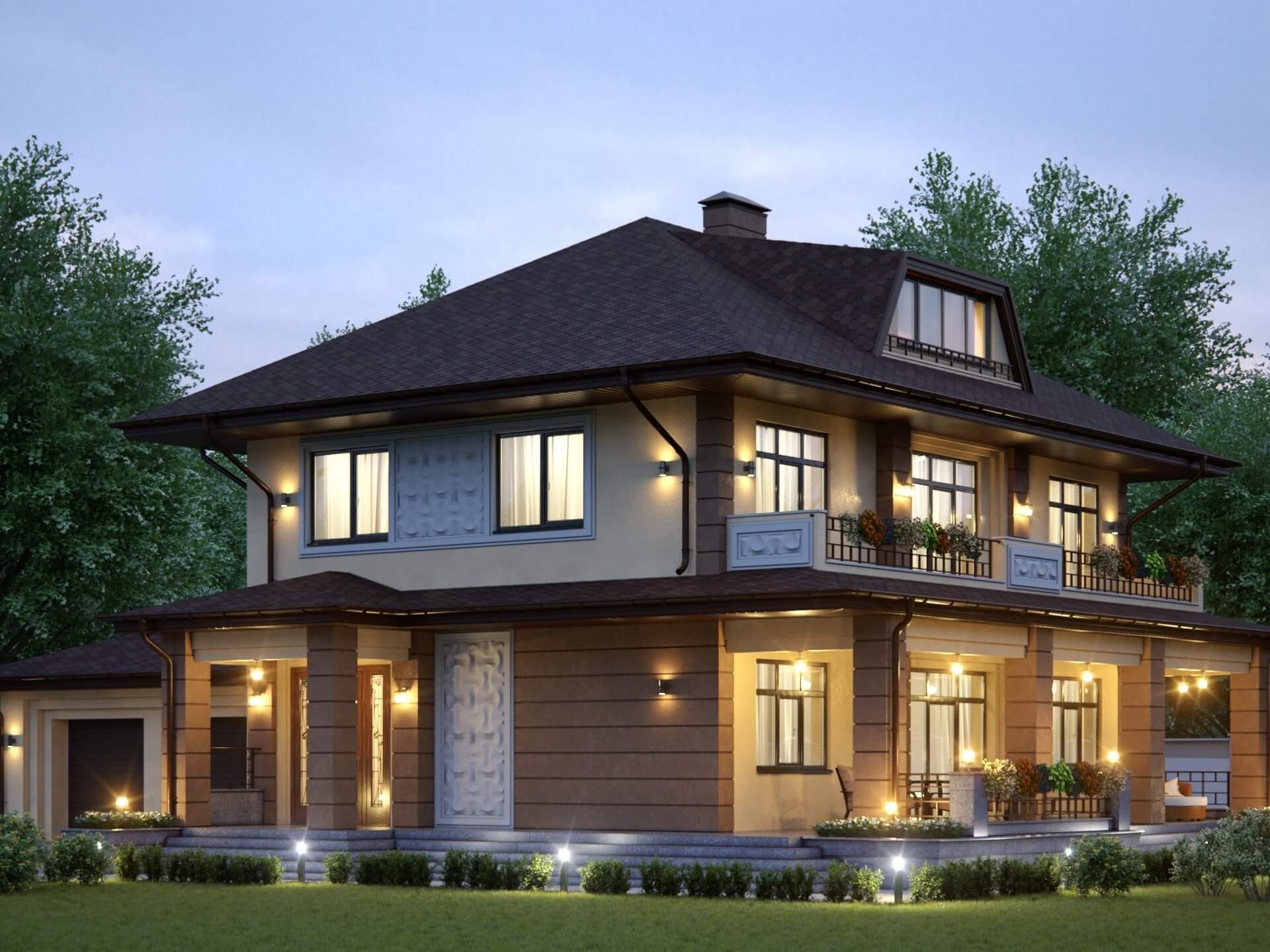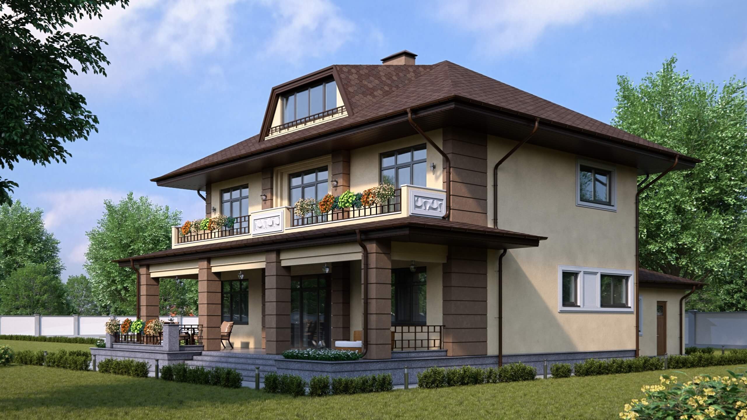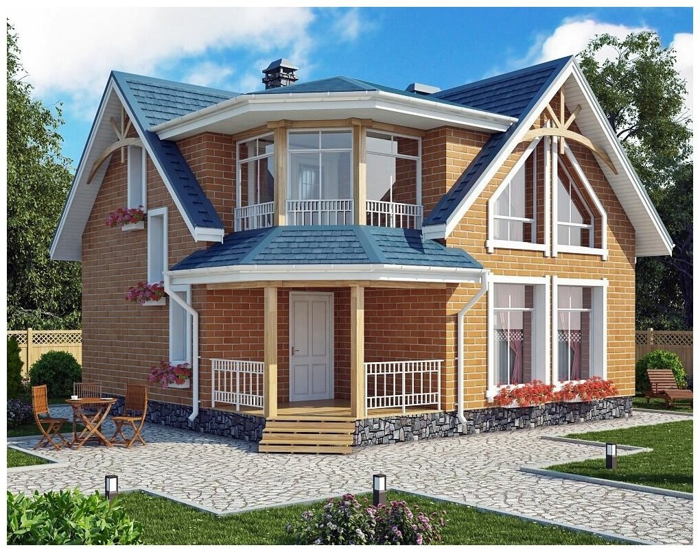 Двухэтажный дом с мансардой и балконом