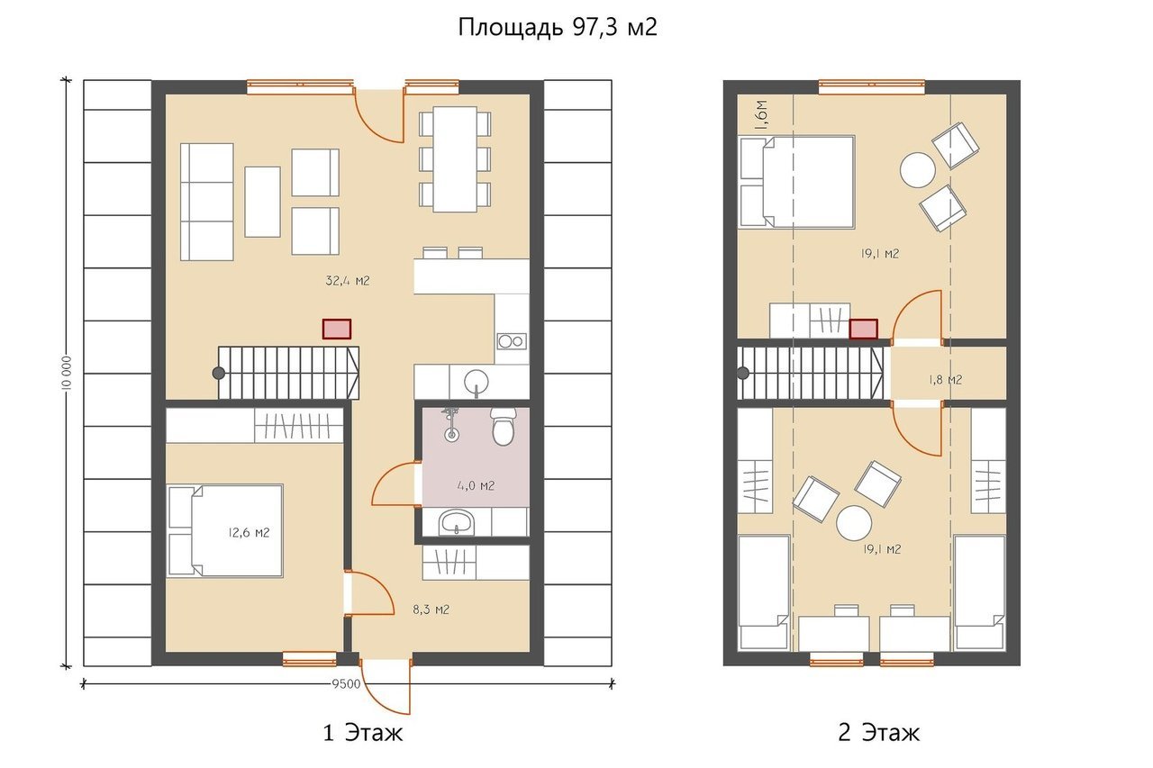 Дачный двухэтажный домик внутри